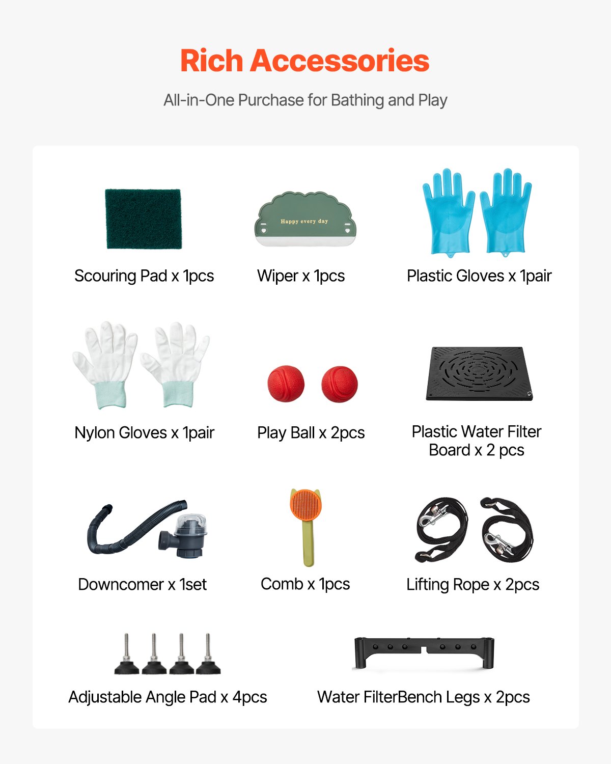 The pet washing sink includes a showerhead, faucet, and a direct connection to a home hose for durability. It also comes with cleaning cloths, a squeegee, play balls, a brush, and gloves, allowing your pet to fully enjoy their bath time