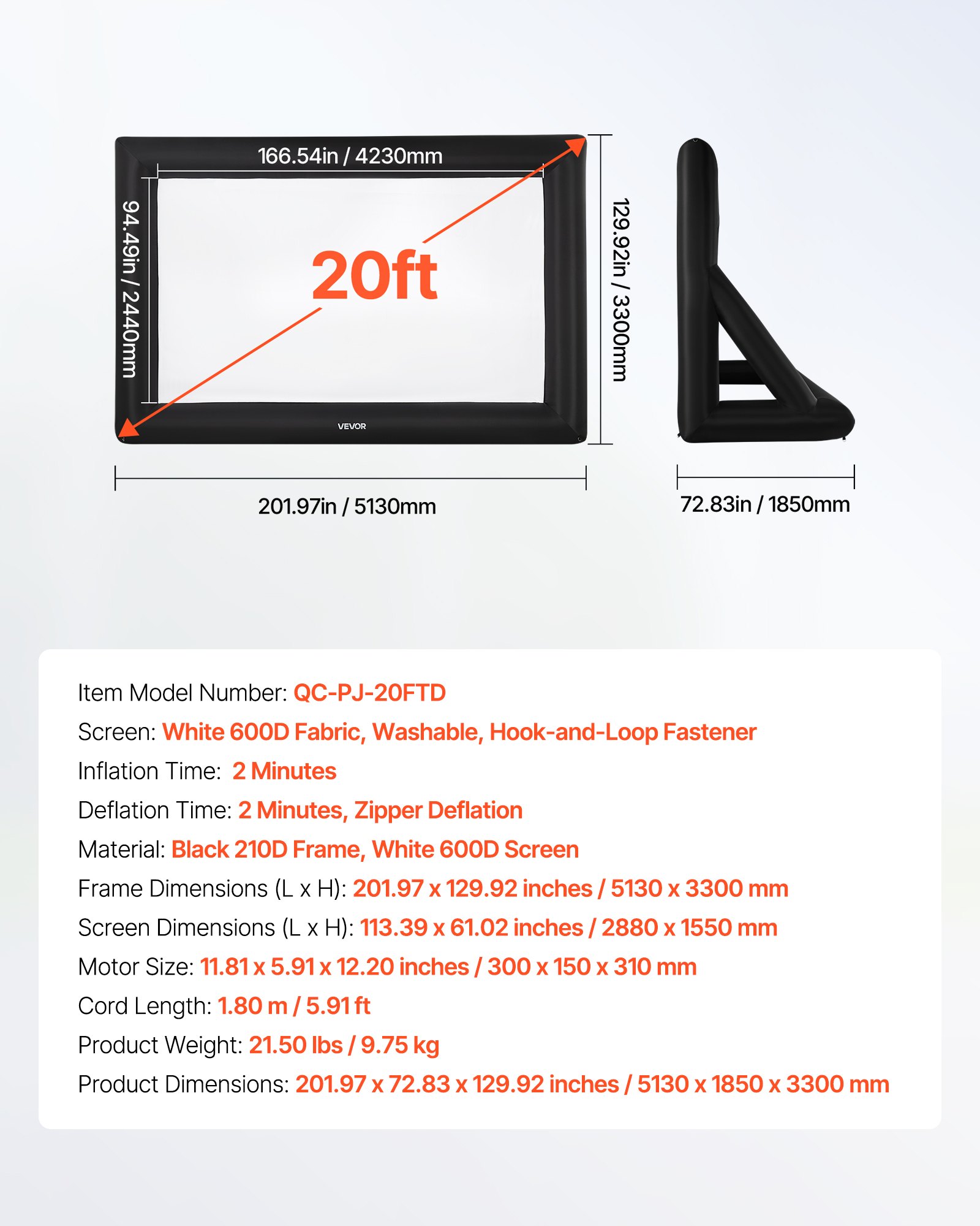VEVOR 20 ft Inflatable Movie Screen 16:9 600D Movie Projector with Portable Bag
