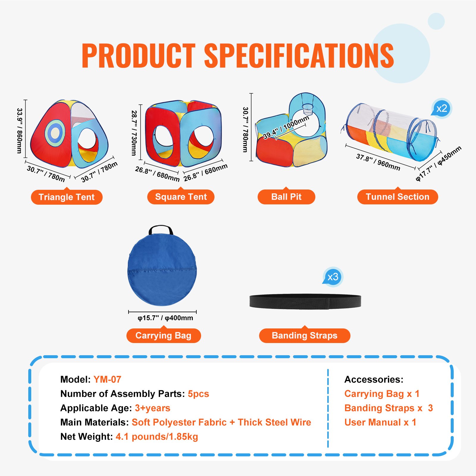 This tent tunnel consists of 5 segments, with a tunnel diameter of _17.7”/450mm and a spacious entrance suitable for kids of various sizes. Recommended for children aged 3+ years, they can climb and play inside and even place toys like playballs (to be provided separately). It’s also suitable for pets like cats and dogs to crawl and play in.