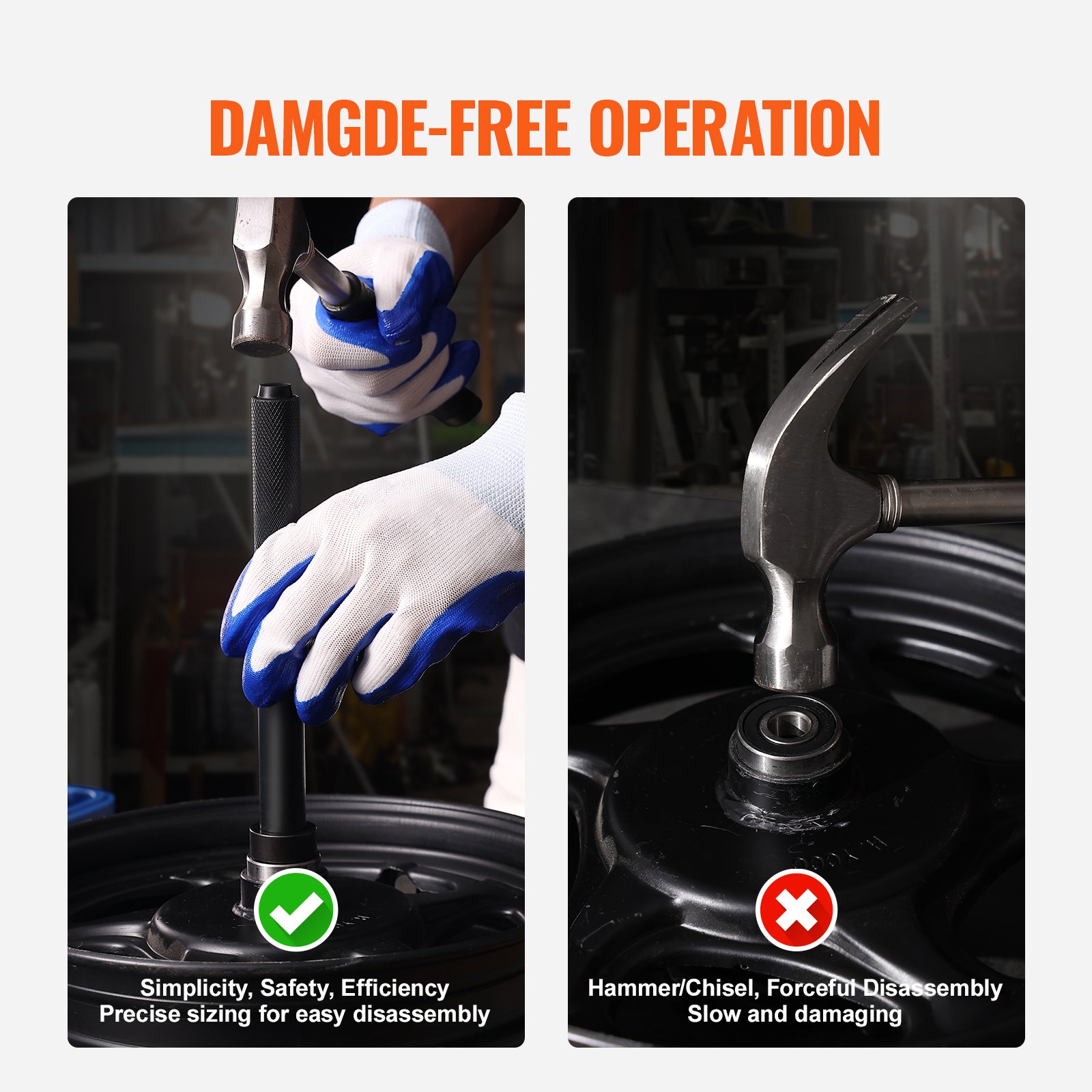 Assemble the handle and disc quickly and securely with screws. This design prevents the loosening of the disc and minimizes the risk of damaging bearings or other components; no need to use the inefficient and harsh hammer or chisel.