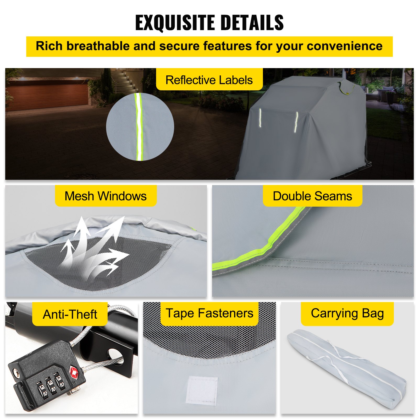 Our motorcycle shelter features upgraded 420D oxford waterproof fabric and sewing process with PU adhesive sticker, bearing high pressure. Furthermore, the black powder-coated steel frame is durable, sturdy, corrosion-resistant, designed for long-lasting use.