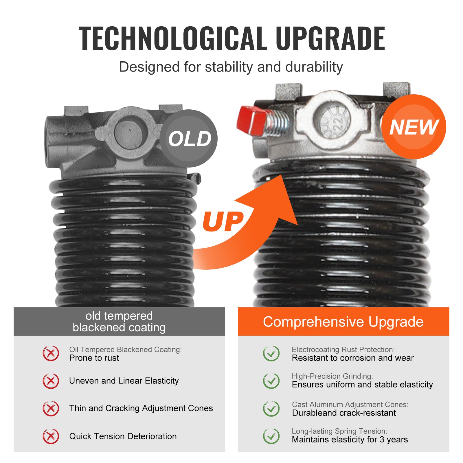 Our garage door springs are made of professionally heat-treated spring steel coils and aluminum cones. With advanced electrocoating surface treatment, they boast excellent corrosion resistance and wear resistance, eliminating the need for additional lubrication and providing a longer lifespan.