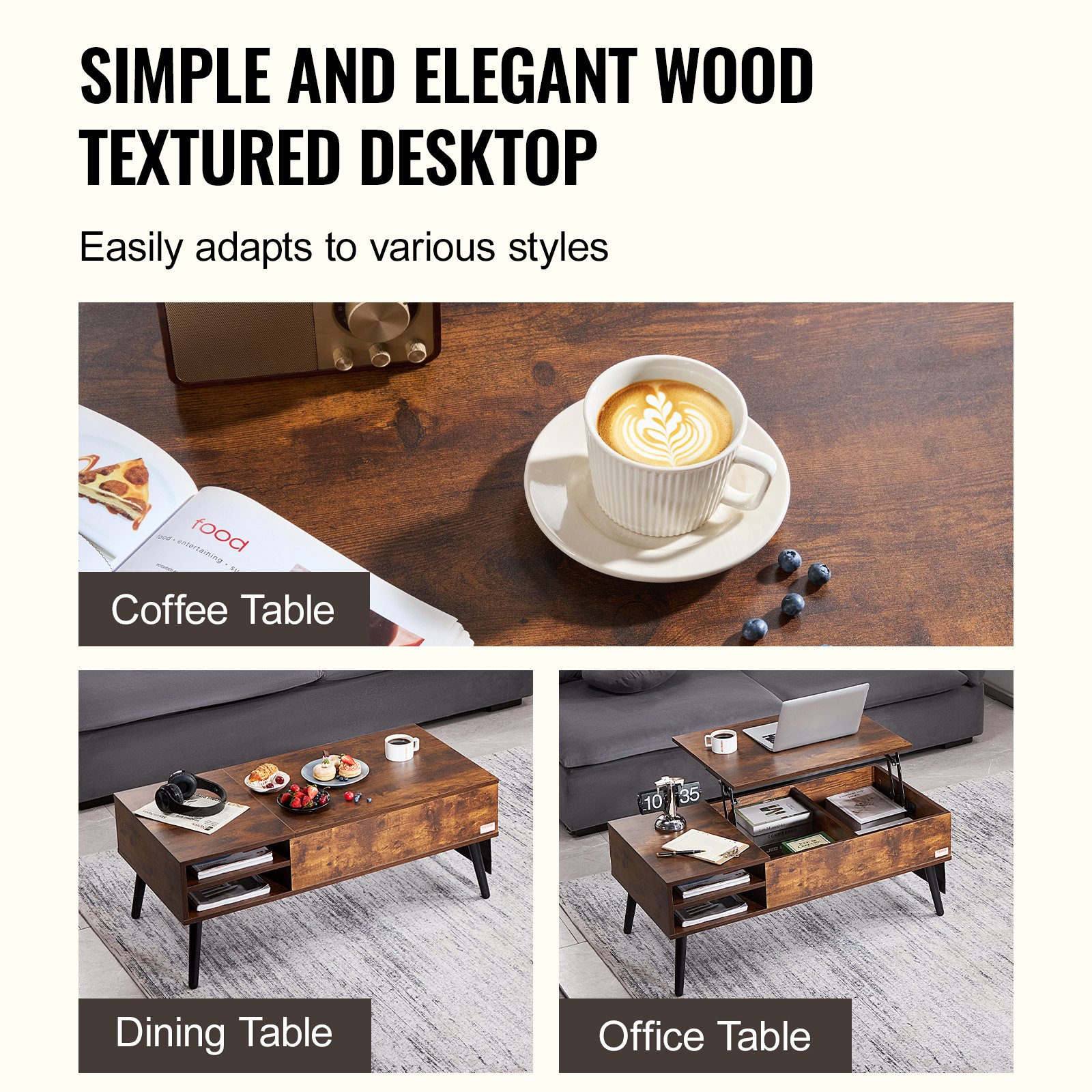 The lift top coffee table built with a high-quality metal structure, the lifting mechanism allows the tabletop to smoothly adjust without noise. The coffee table made with high-quality particleboard remains stable and sturdy after correct assembly, with strong load-bearing capacity.
