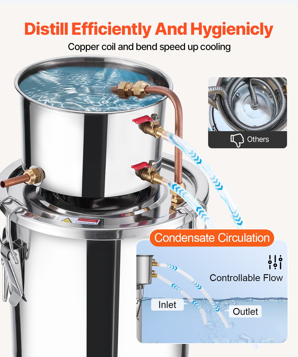 The cooling and distillation process uses copper tube with good thermal conductivity for efficient cooling. The smooth and wrinkle-free interior of the pipes prevents residues of distilled alcohol and water, ensuring no aftertaste. The water inlet and outlet valves can control the flow rate and the cooling speed.