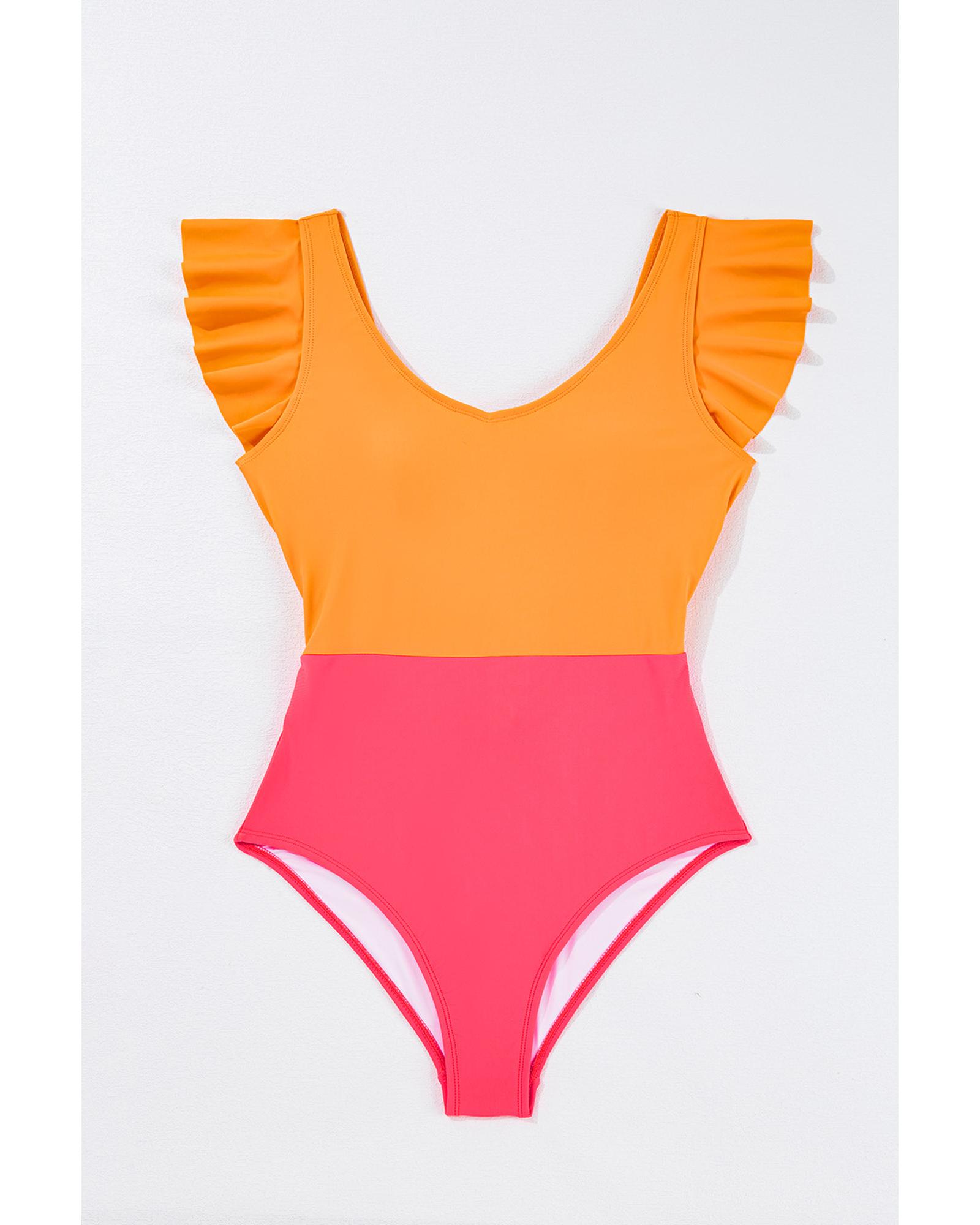 Vitality Orange Color Block Ruffled Knotted Backless One Piece Swimsuit – L