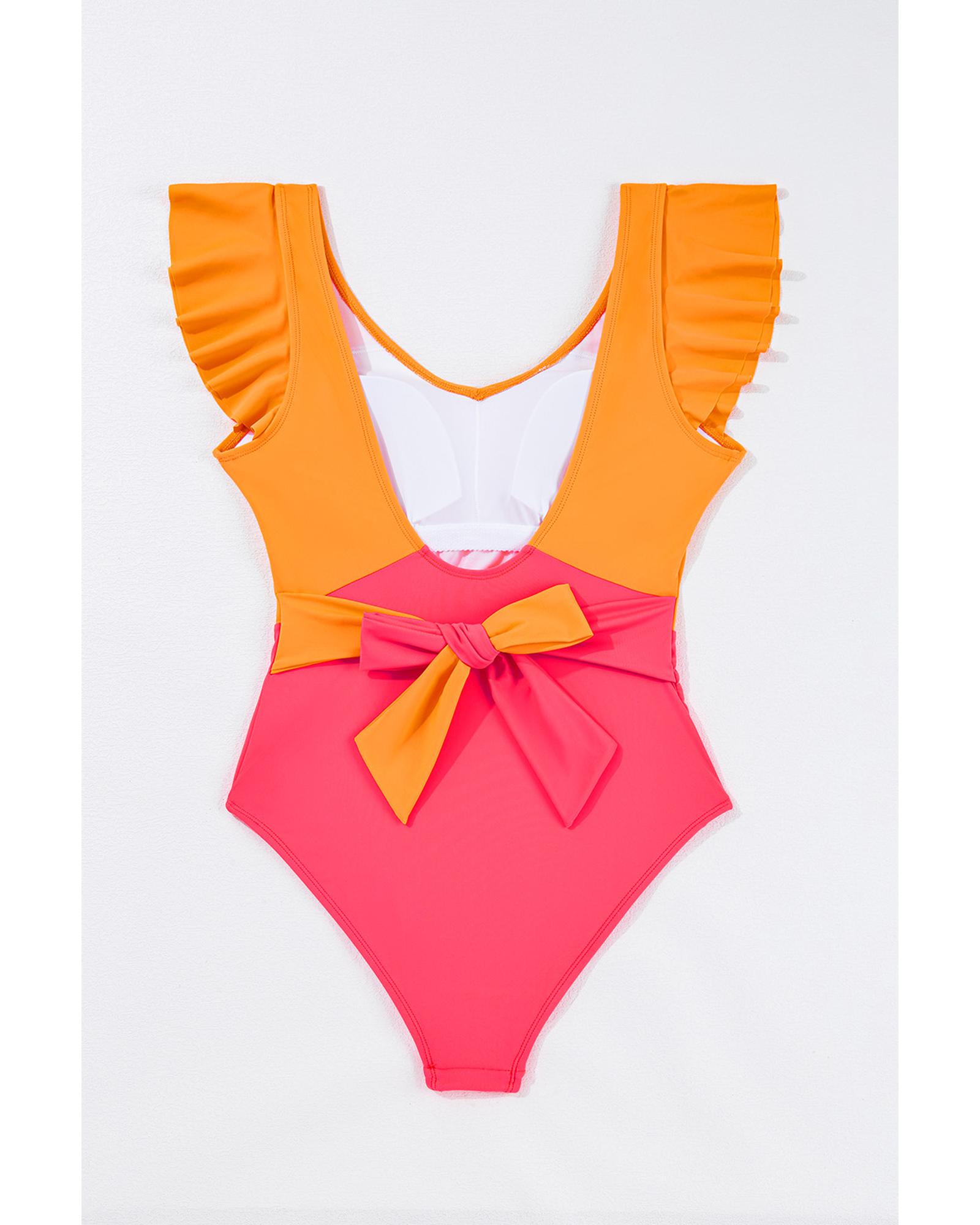 Vitality Orange Color Block Ruffled Knotted Backless One Piece Swimsuit – M