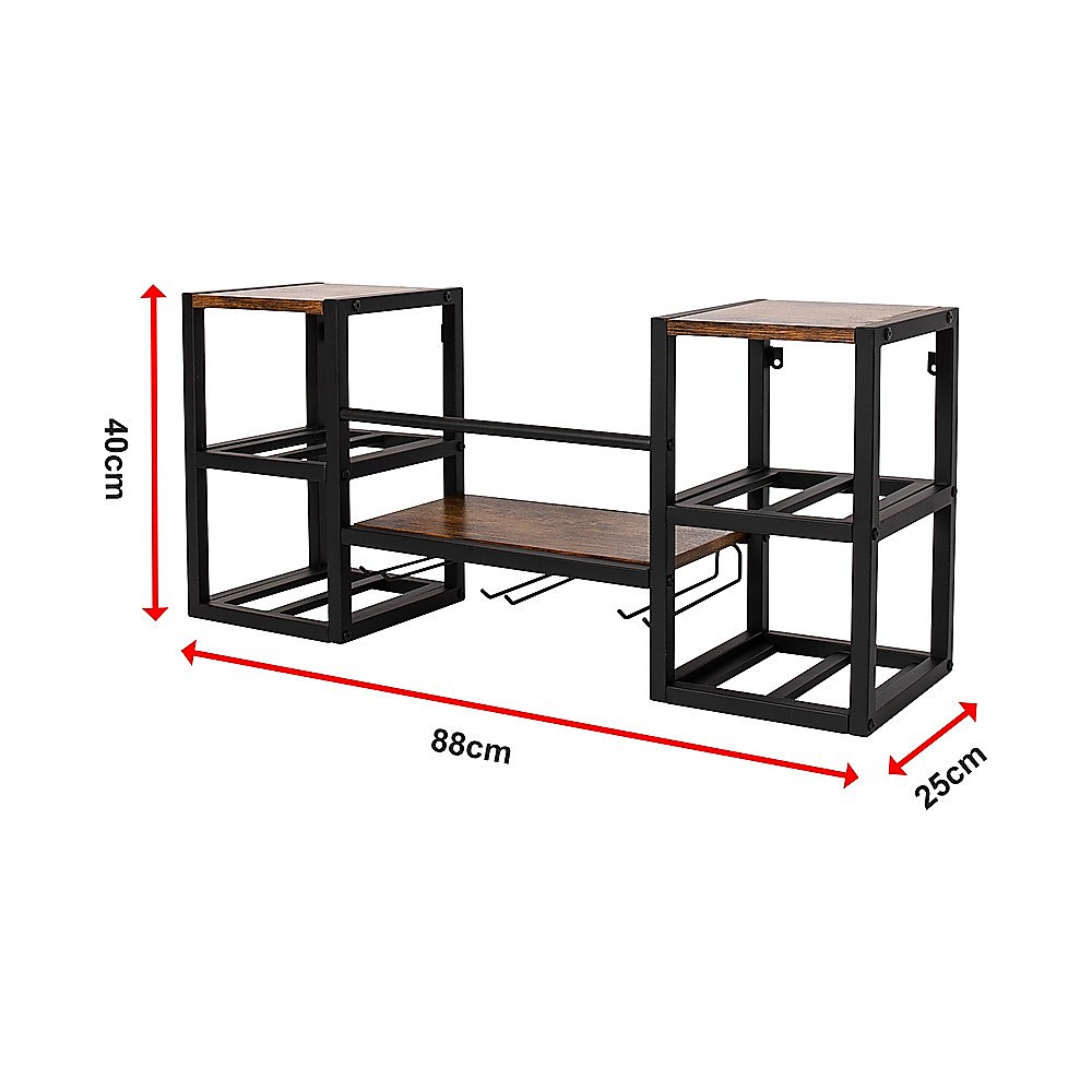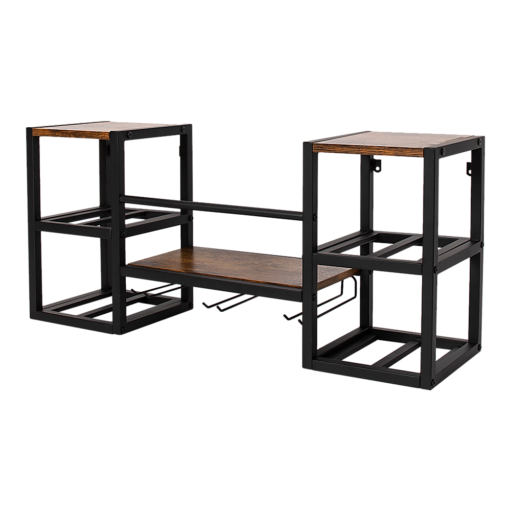 Introducing our versatile storage shelf that serves as a wine bottle holder and stemware rack, capable of accommodating up to 16 bottles of your favorite wine. It also features a hanging glass holder for added convenience. The top shelf offers additional storage space, perfect for displaying decorative items like plants, vases, and books.