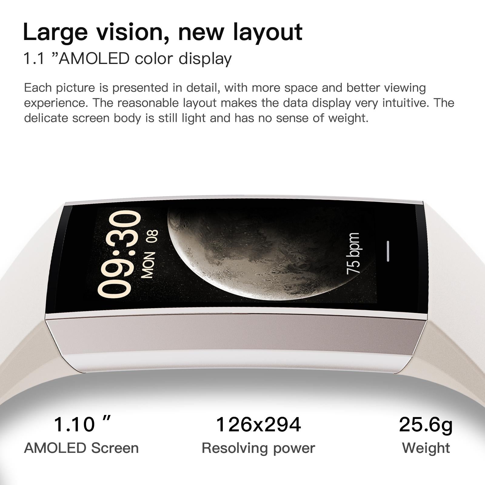 • 1.1-inch AMOLED HD Touch colour screen for clear call and message reminders