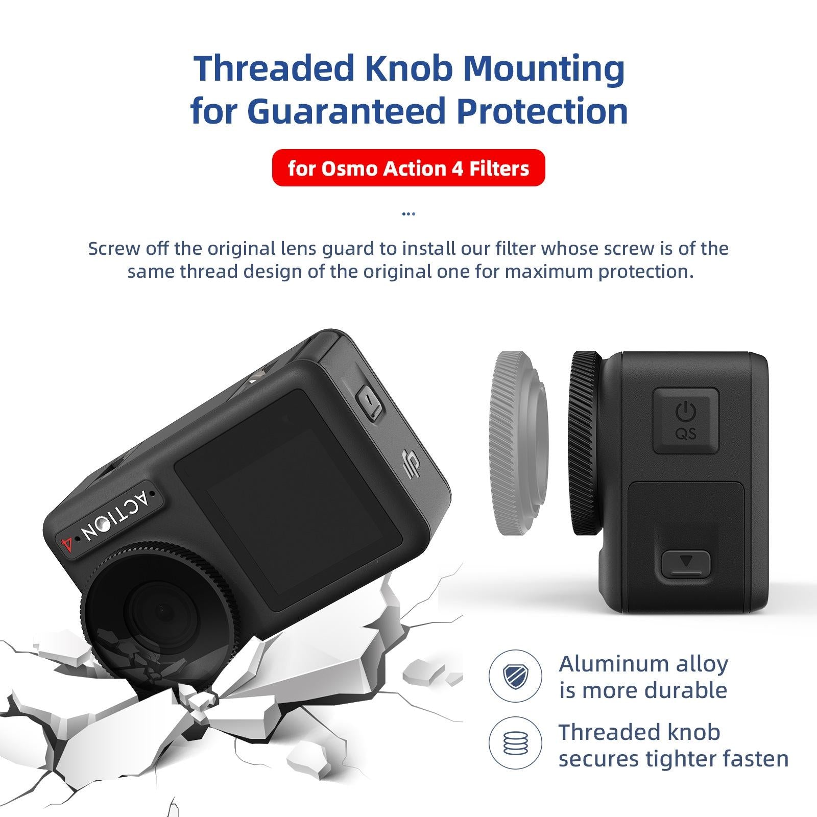 • Adopting the same thread design as the original lens, after unscrewing the original protective lens, then screw to install the filter, waterproof, anti-fog, drop-proof