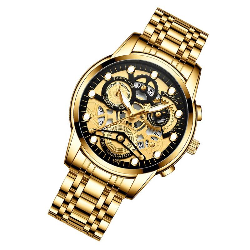 Waterproof Luminous Men Quartz Watch – Hollow Design – Brown Leather Gold Surface