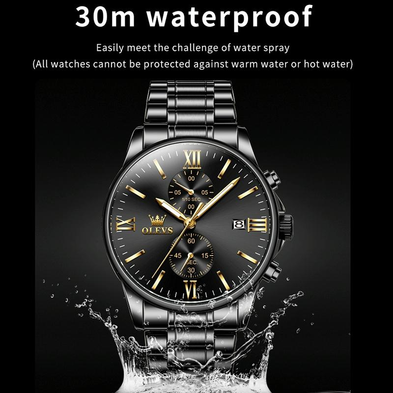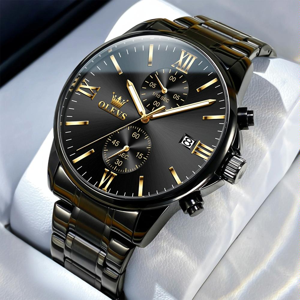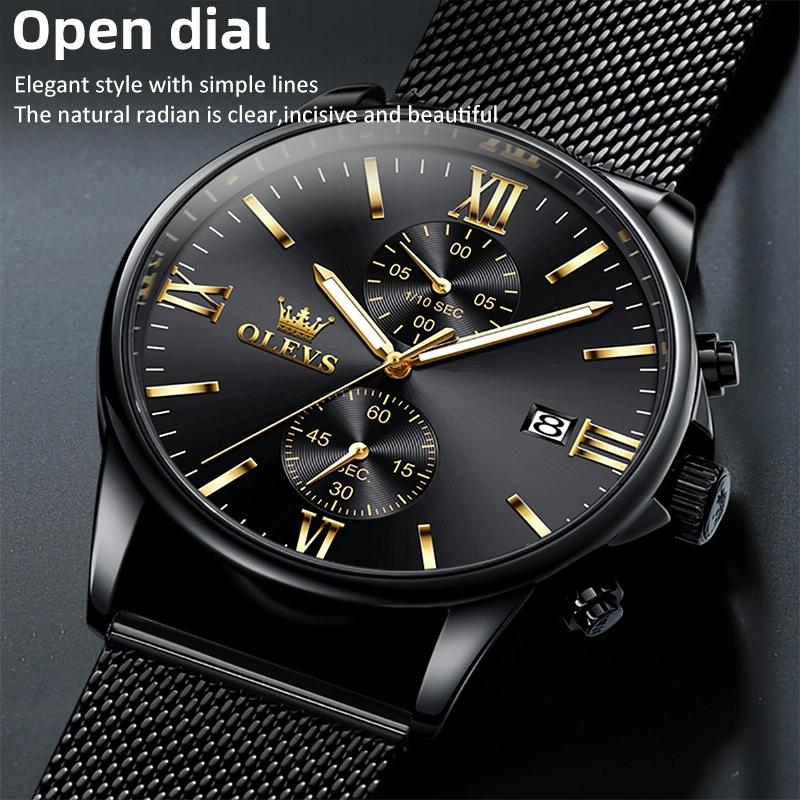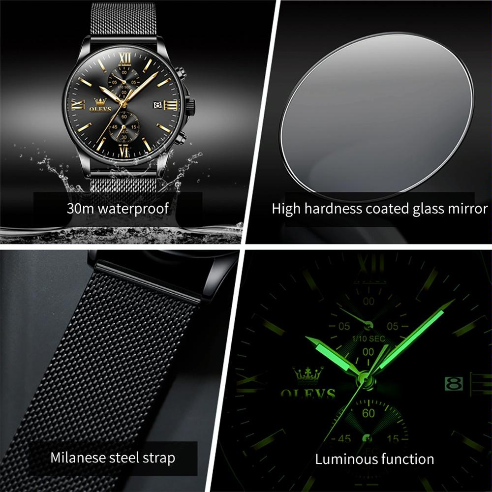 Waterproof Men Chronograph Quartz Watch with Luminous Dial – Black Gold Mesh Strip