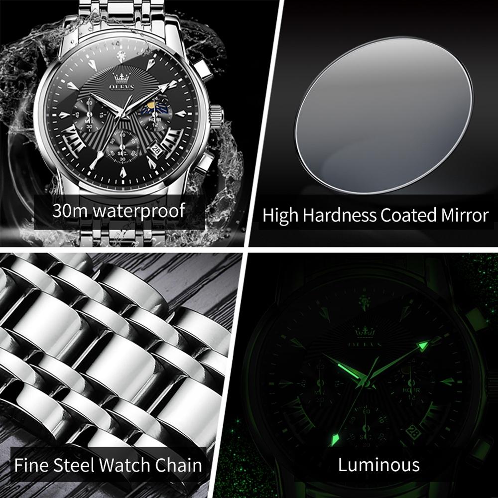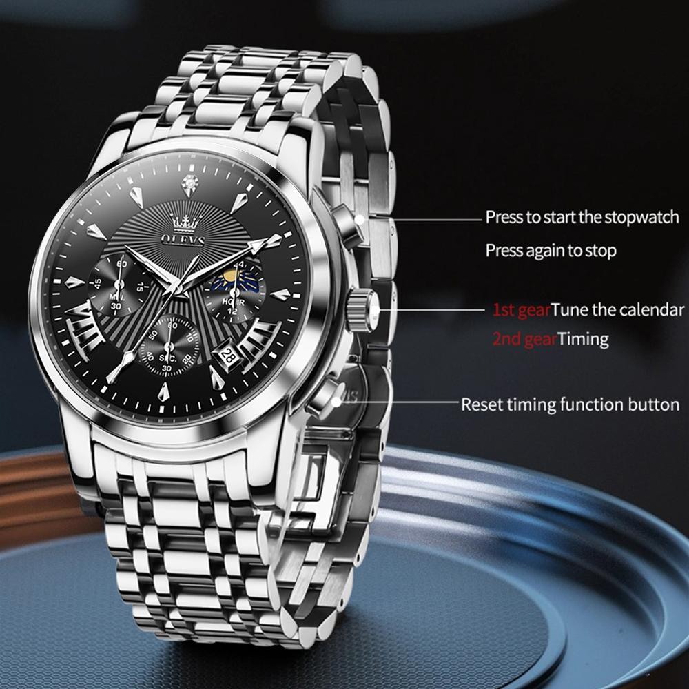 Waterproof Men Quartz Watch – Multifunctional Business Design – Black + Silver