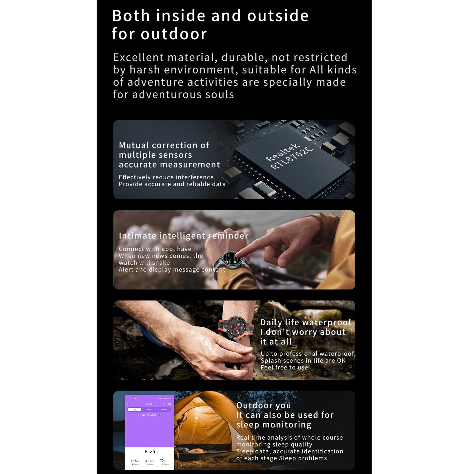 • Sleep monitoring with sleep time and quality analysis