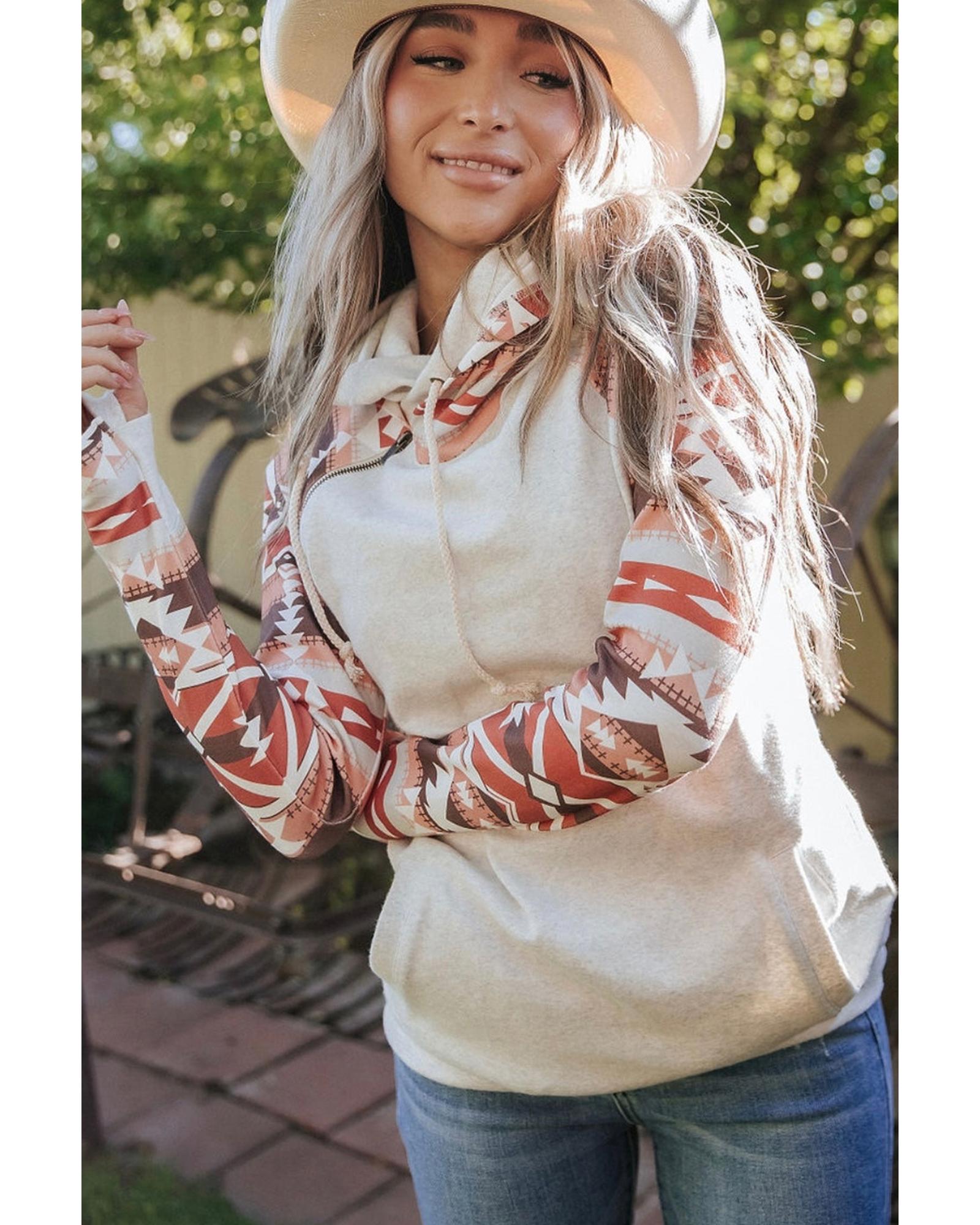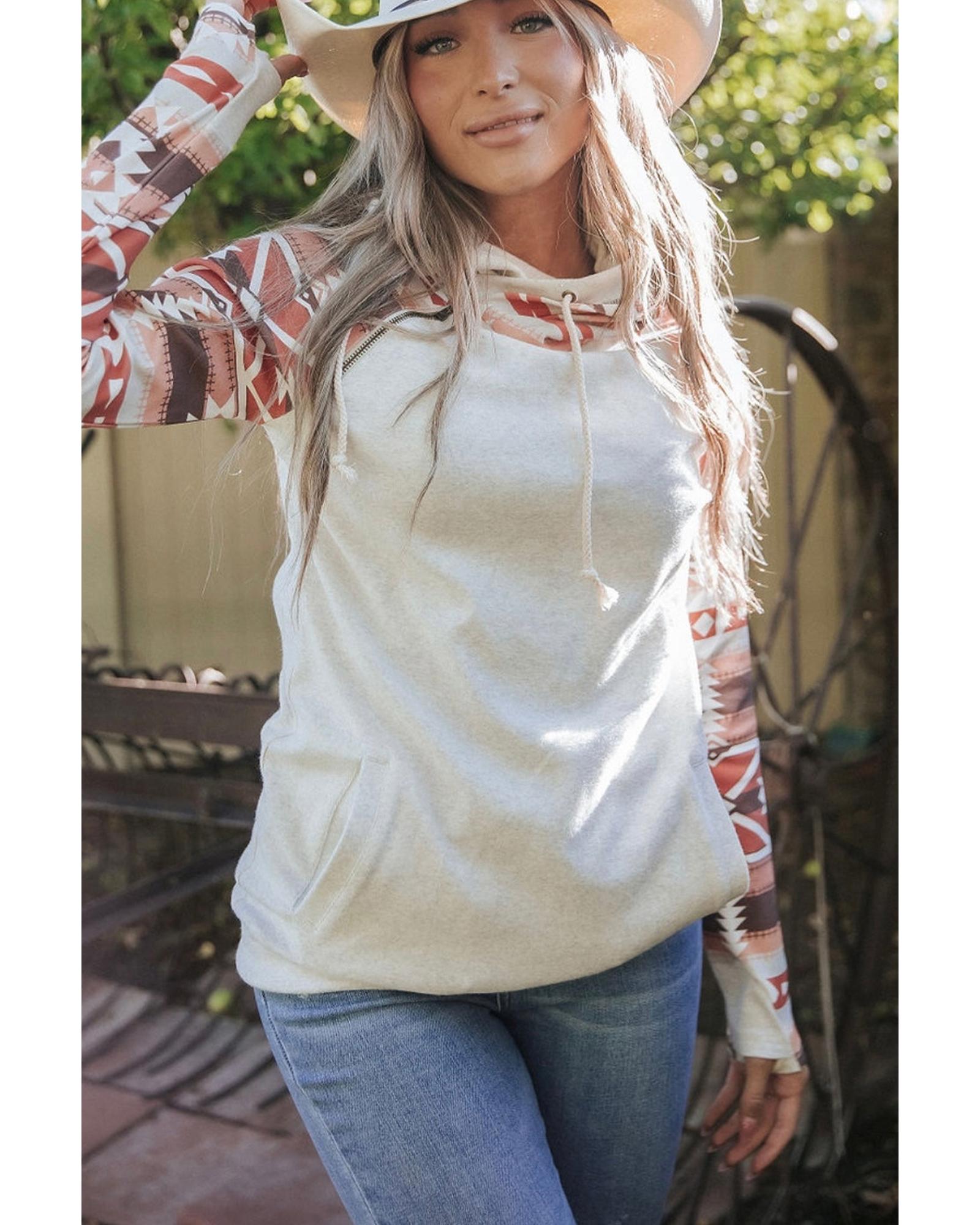 Western Aztec Print Patchwork Double Hood Hoodie – L