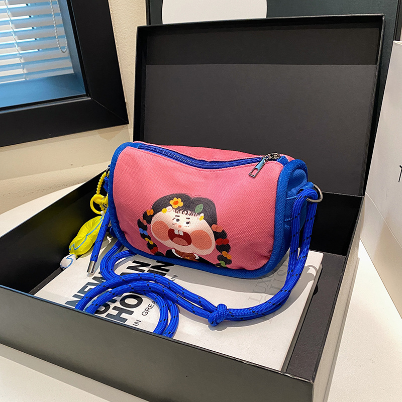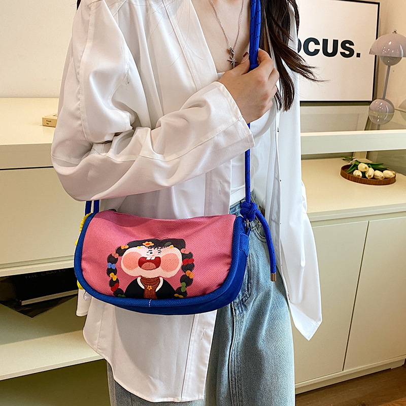 Whimsical Cartoon Girl Crossbody Bag – Lightweight Canvas with Adjustable Rope Strap & Flower Charm