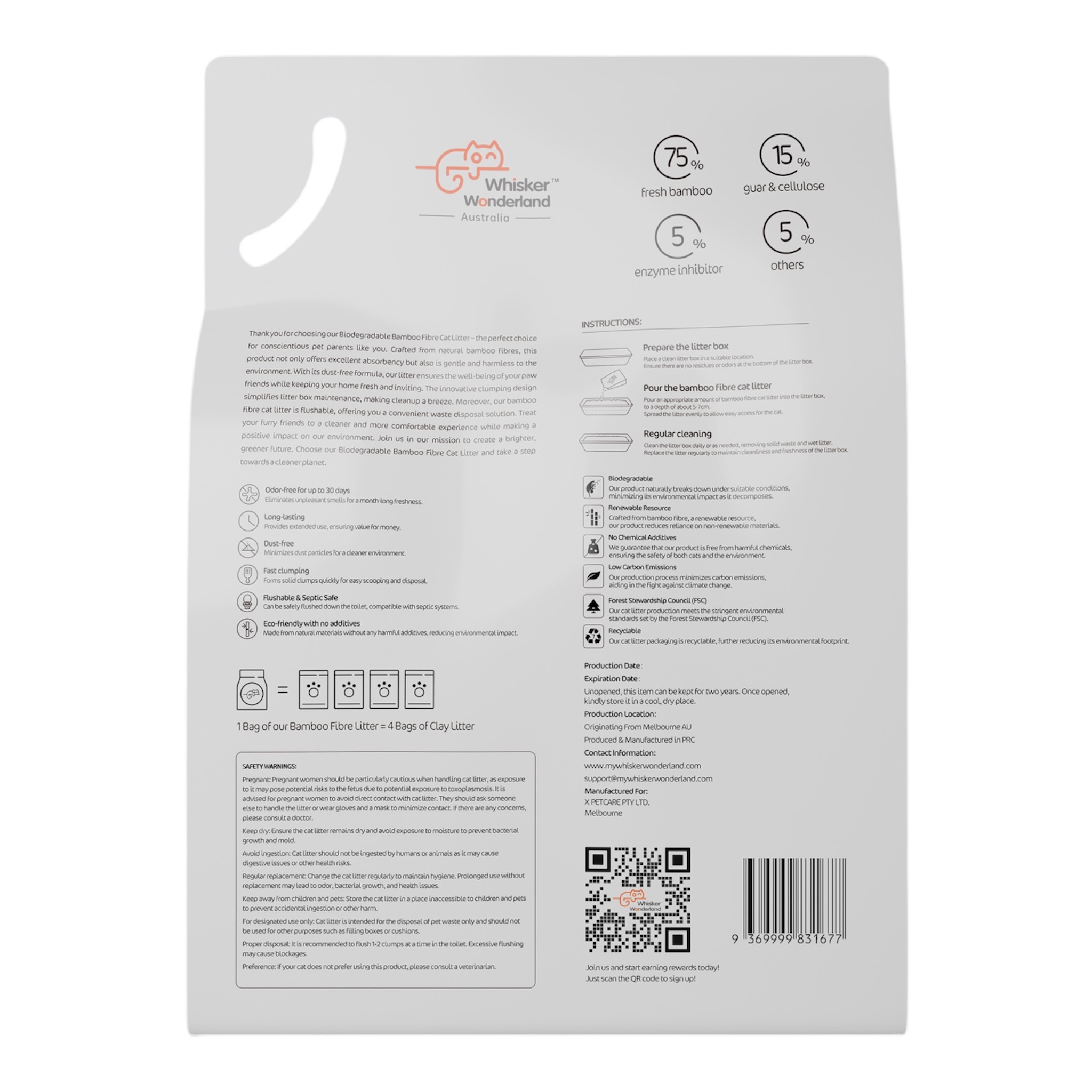 We are well aware of the potential impact of dust on your cat’s respiratory health. Therefore, Whisker Wonderland Bamboo Fibre Cat Litter features an advanced dust-free formula, minimising dust production to the greatest extent, protecting your pet’s respiratory system, and ensuring a cleaner home environment. For pet owners who value sustainability and high-quality living, this cat litter is undoubtedly an ideal choice. By choosing Whisker Wonderland, you’re choosing to care for your pet, take responsibility for the planet, and together, step towards a healthier, greener future.