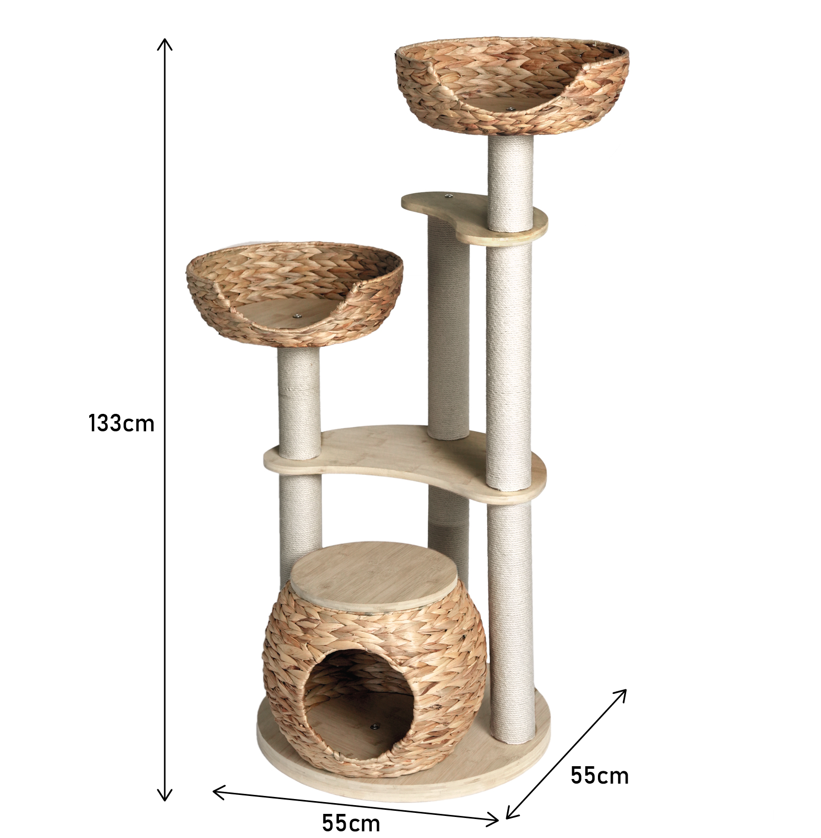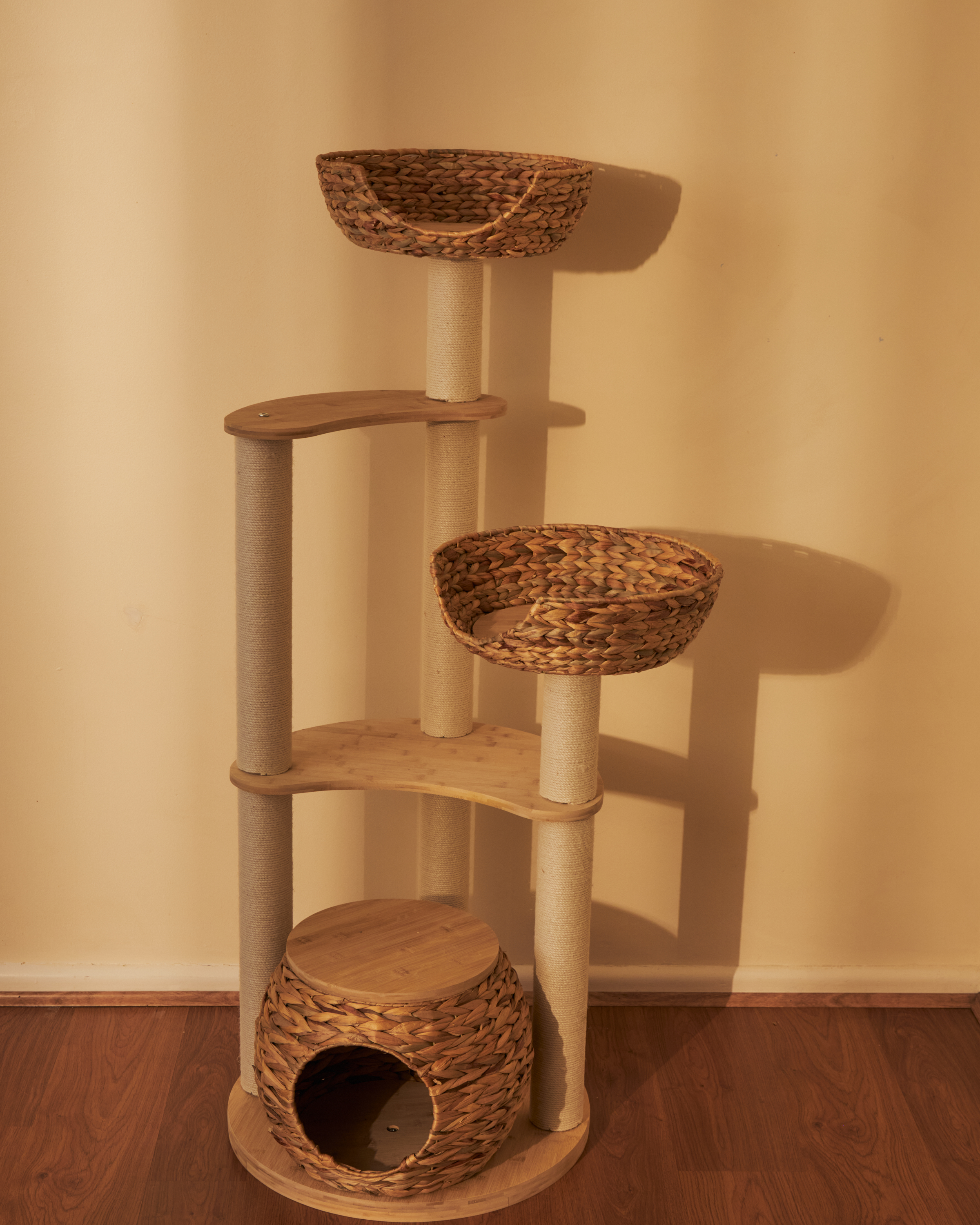 This cat tree not only prioritises environmental responsibility but also considers the physiological and psychological needs of cats in its design. The multi-level platform design satisfies cats’ innate desire to observe from high vantage points, giving them their own ‘territory’. The sturdy bamboo structure ensures the cat tree’s stability, allowing even the most playful cats to climb and jump with confidence. Some areas are wrapped with durable sisal rope, providing an ideal scratching surface for cats, effectively protecting your furniture from damage while also helping cats sharpen their claws and maintain health.