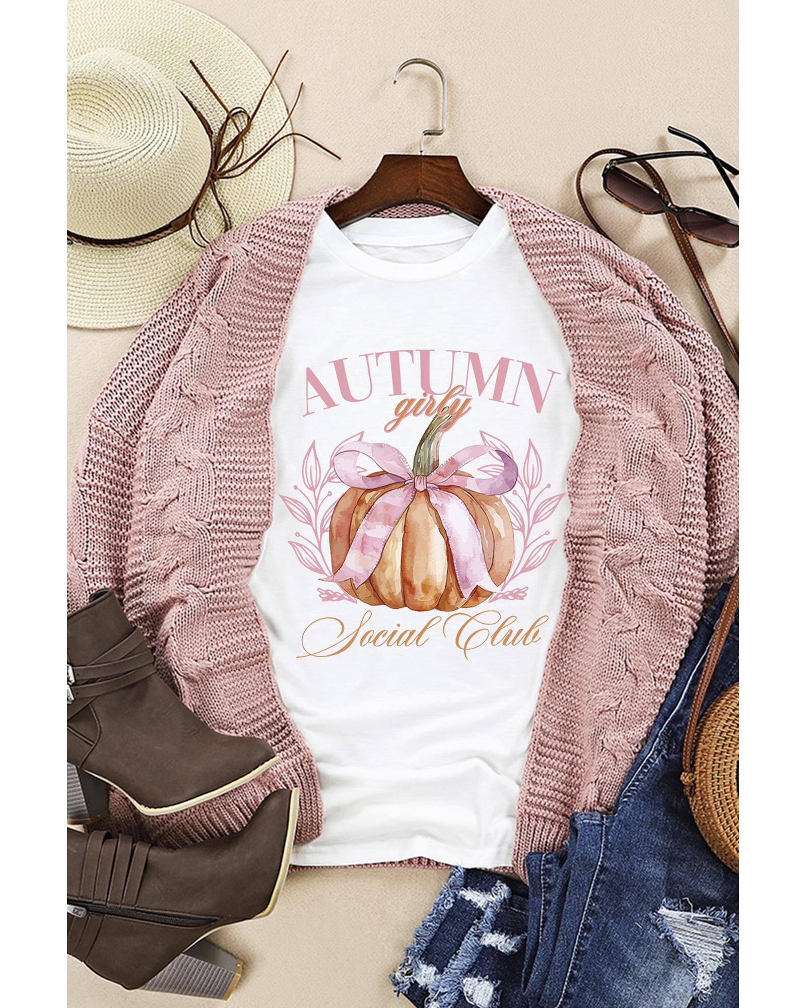 White Autumn Girly Thanksgiving Bowknot Pumpkin Graphic T Shirt – XL