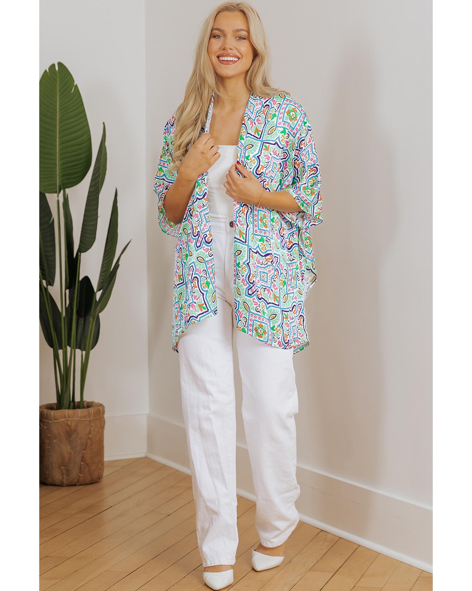 White Boho Floral Printed Rhinestone 3/4 Sleeve Open Front Kimono – M