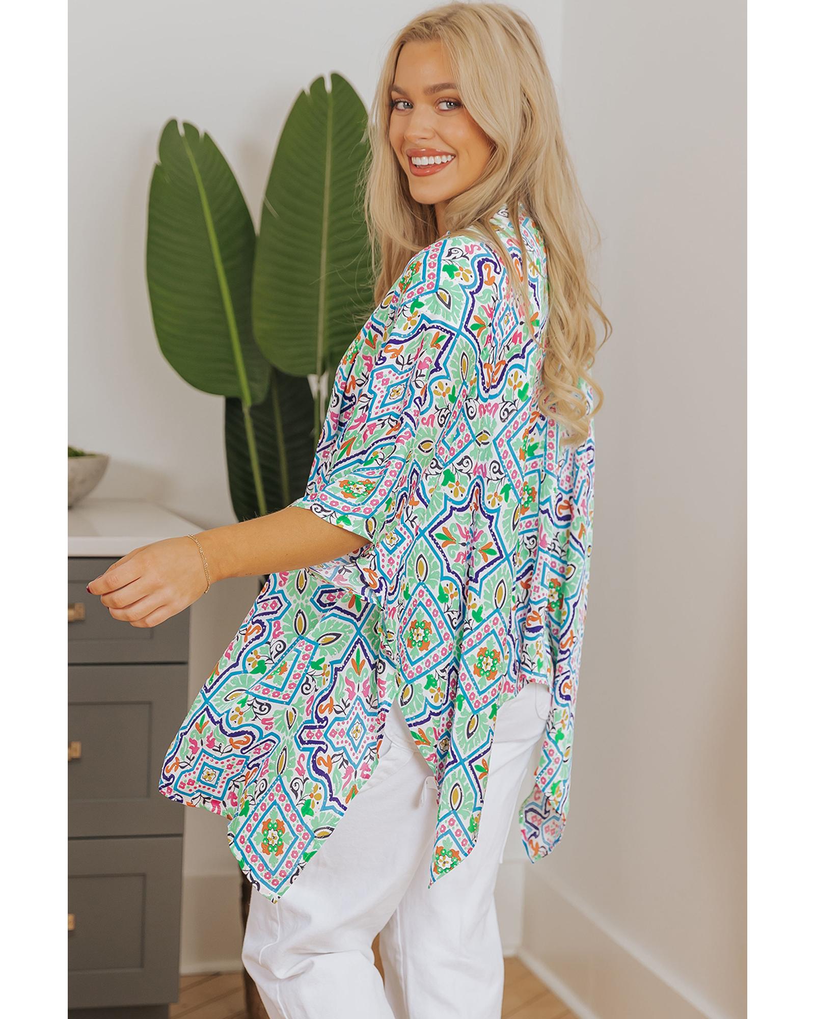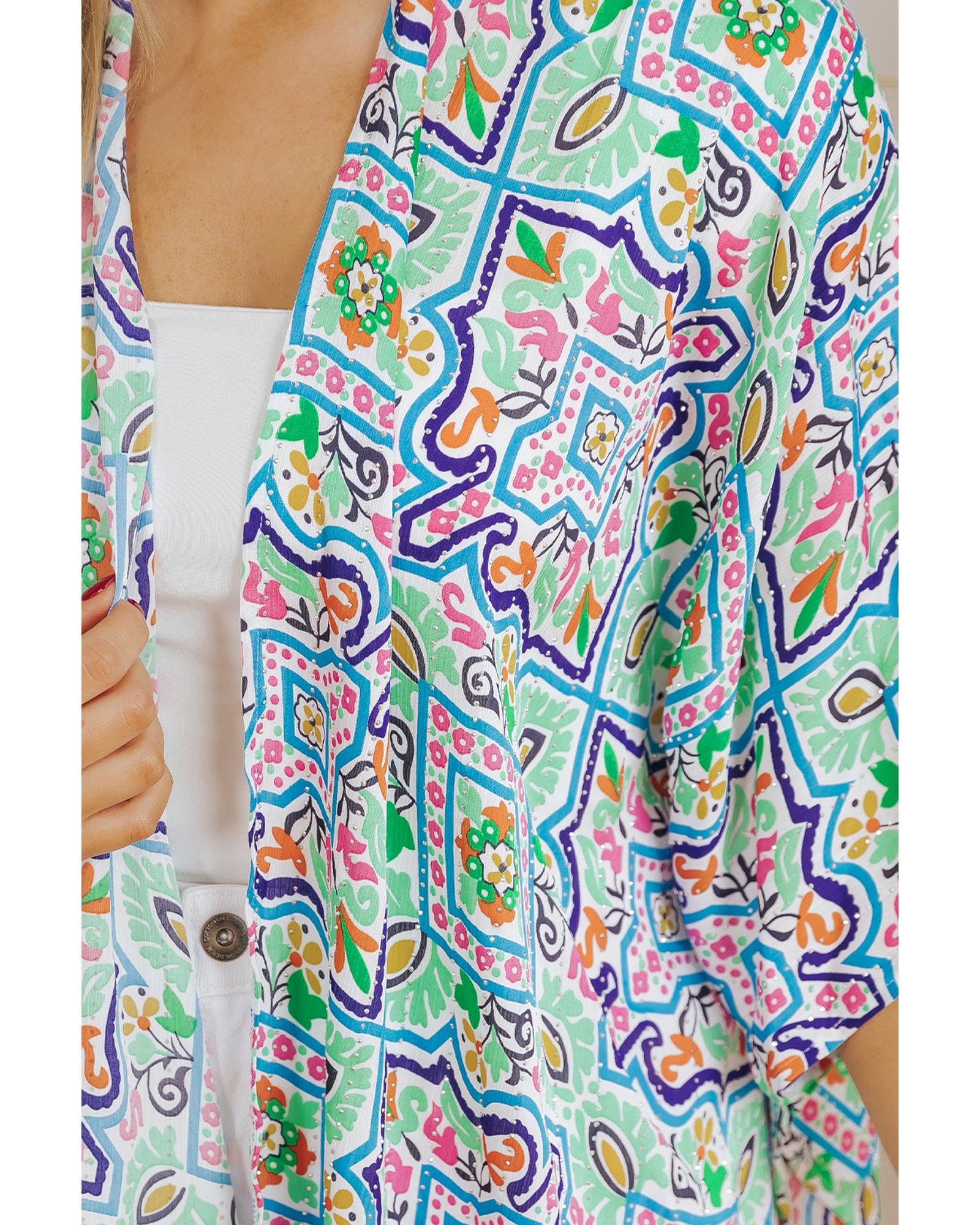 White Boho Floral Printed Rhinestone 3/4 Sleeve Open Front Kimono – S