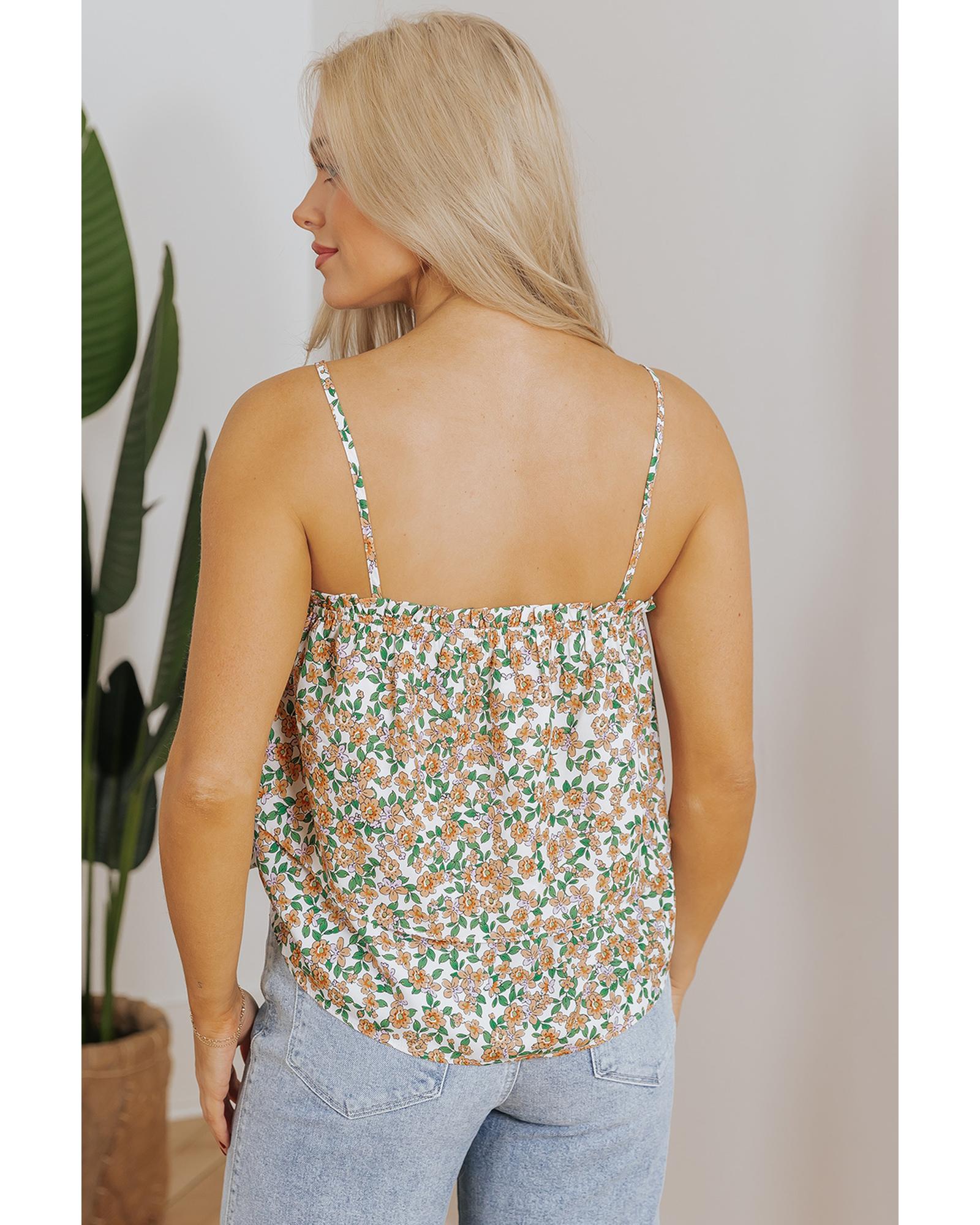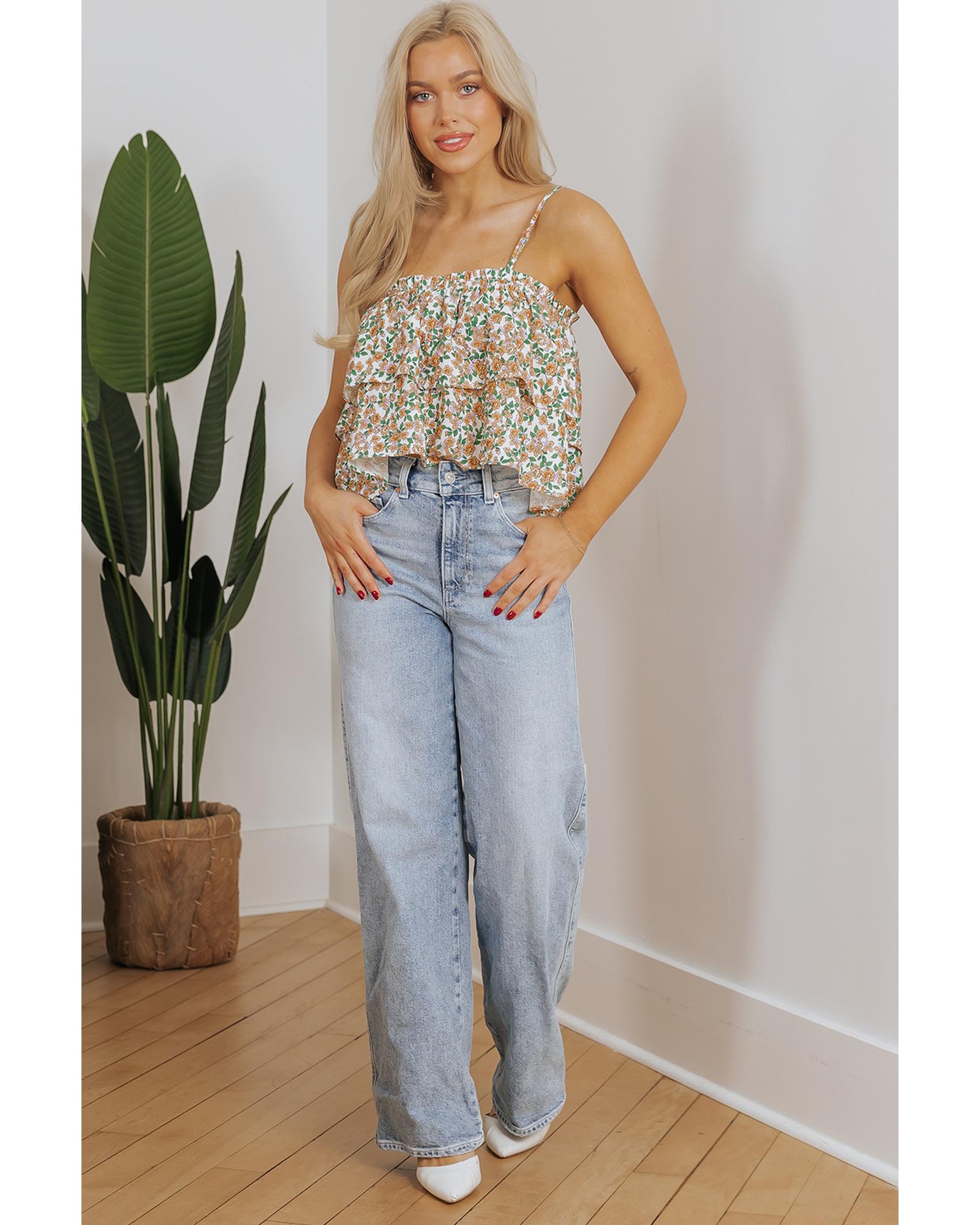 White Boho Floral Spaghetti Strap Ruffle Summer Tank Top – L