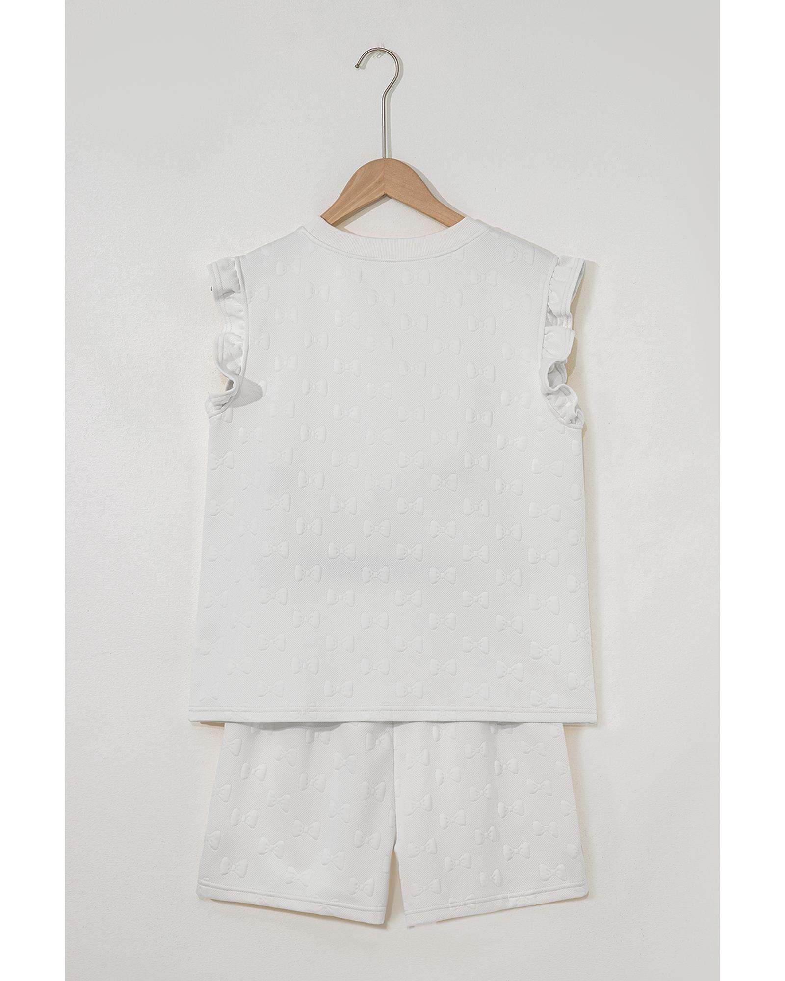 White Bow Jacquard Ruffle Sleeve Short 2pcs Outfit – L