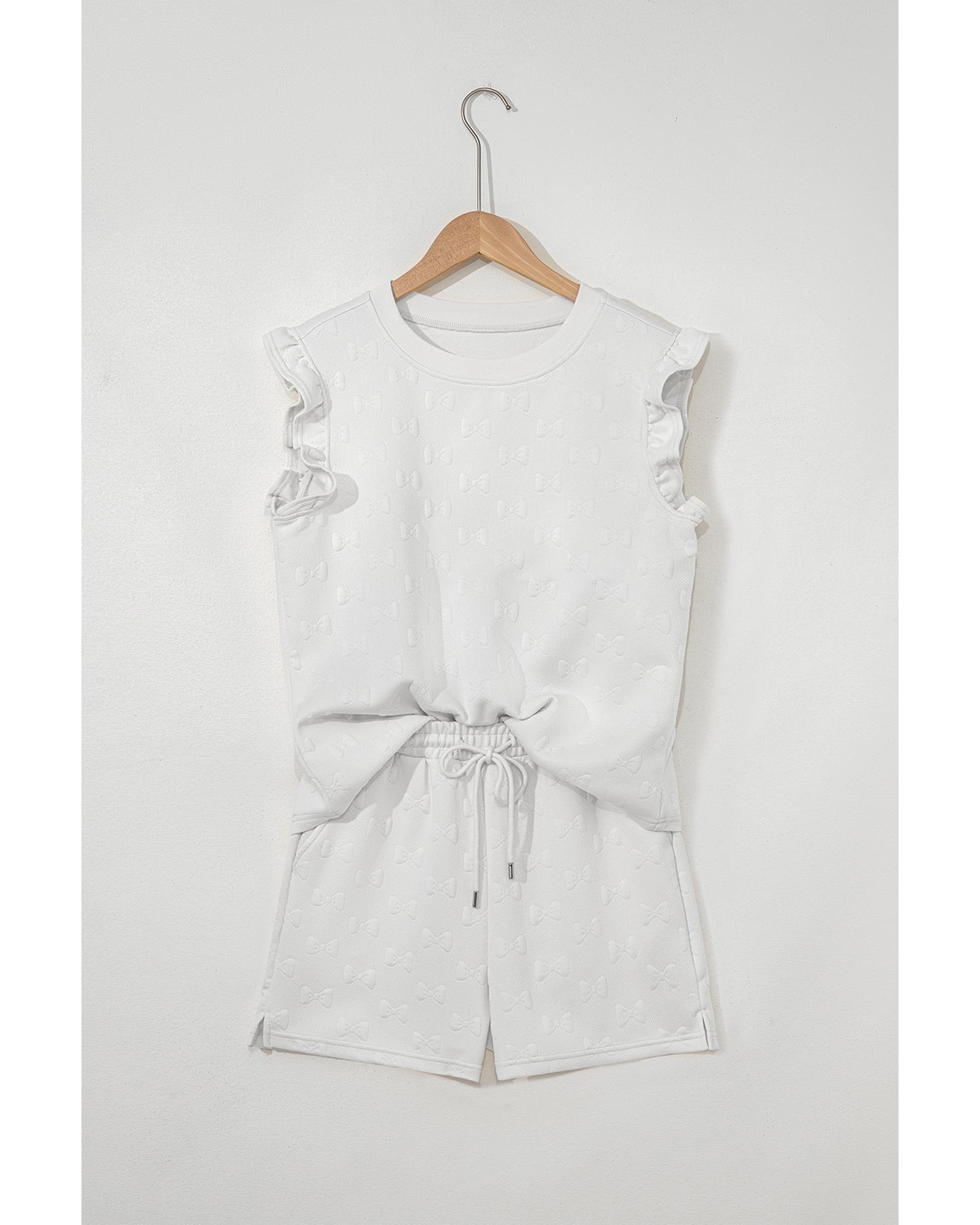 White Bow Jacquard Ruffle Sleeve Short 2pcs Outfit – M