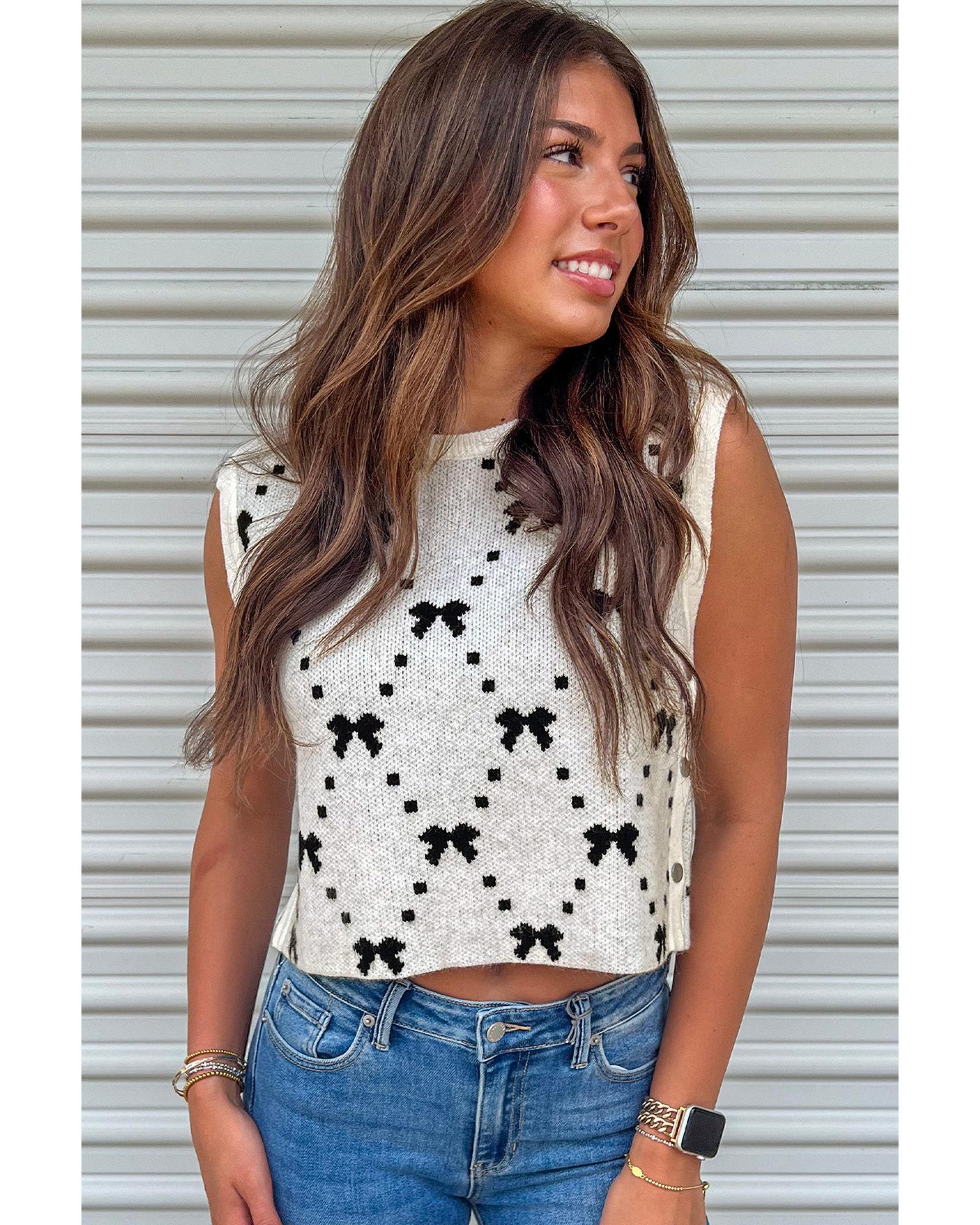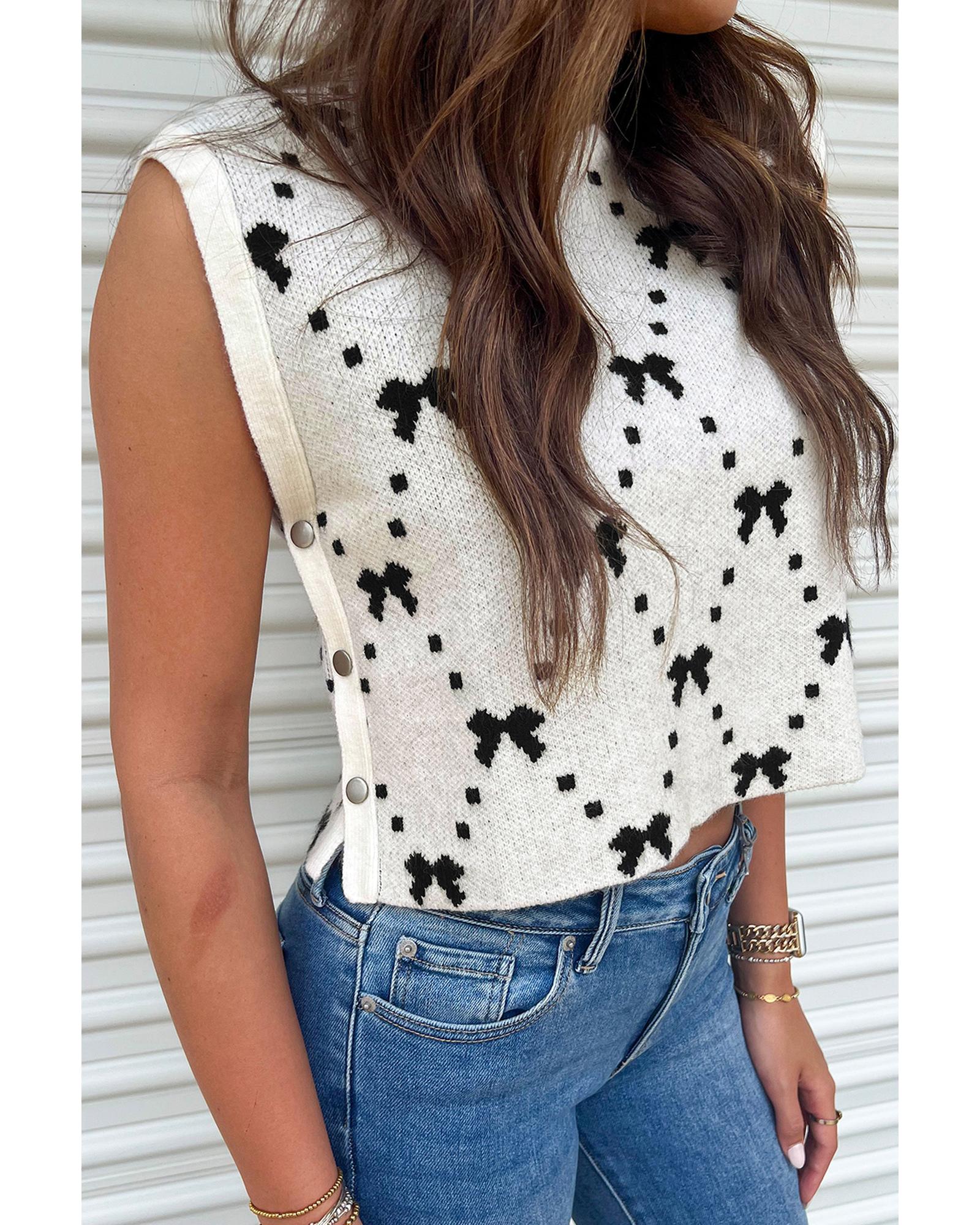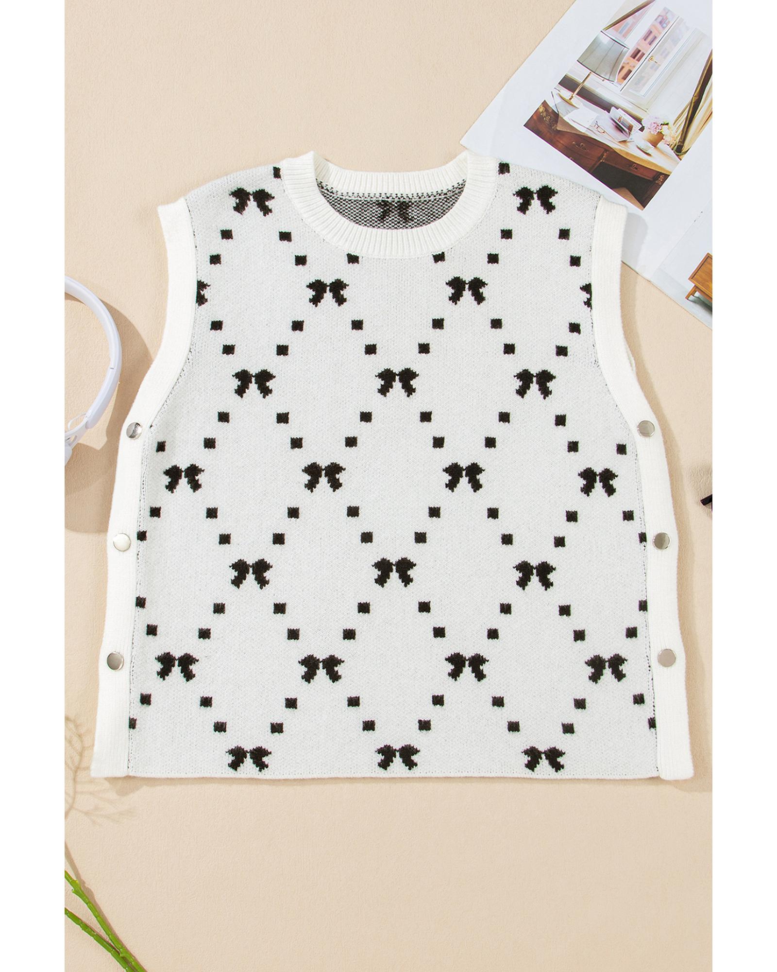White Bow Pattern Buttoned Side Cropped Sweater Vest – M