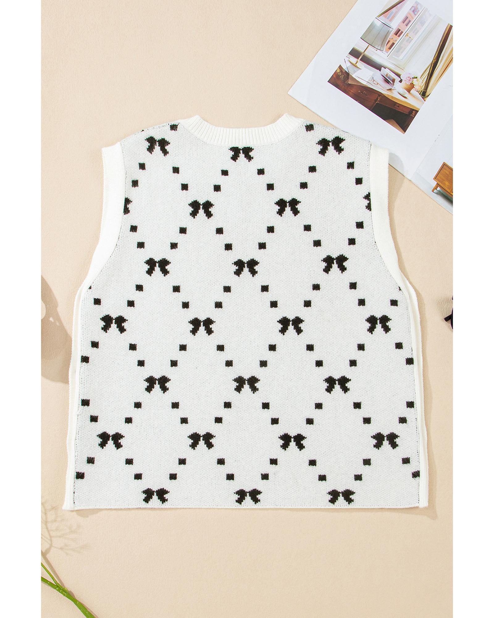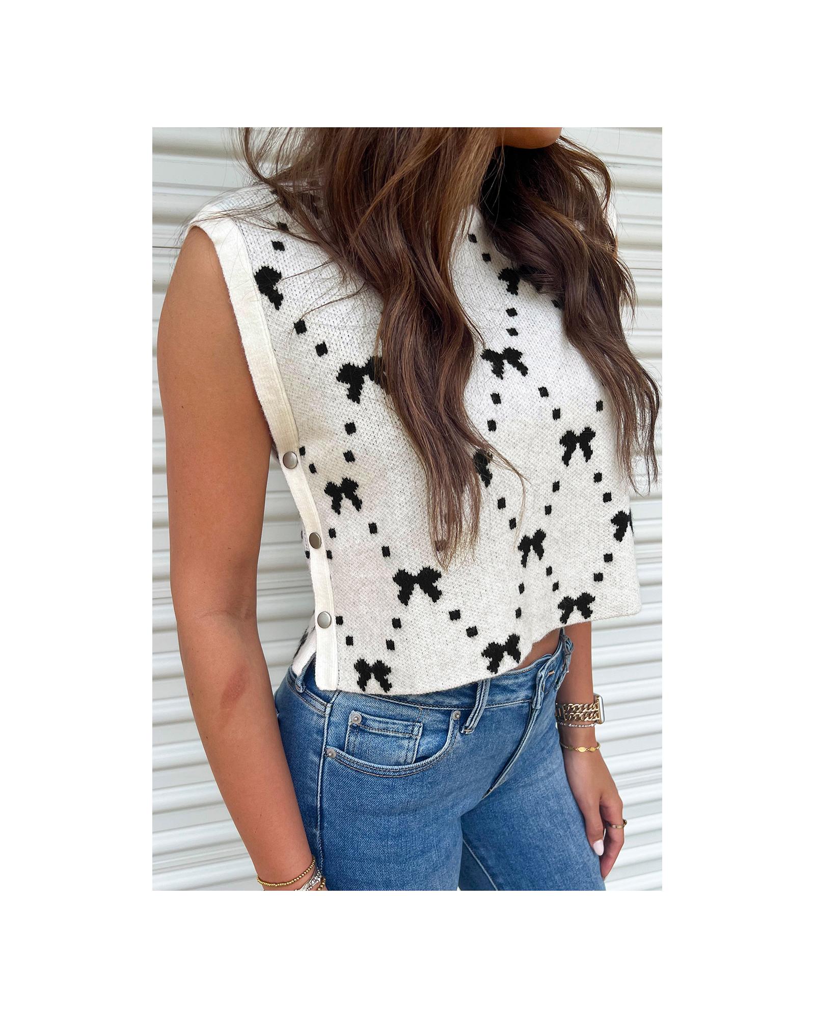White Bow Pattern Buttoned Side Cropped Sweater Vest – XL