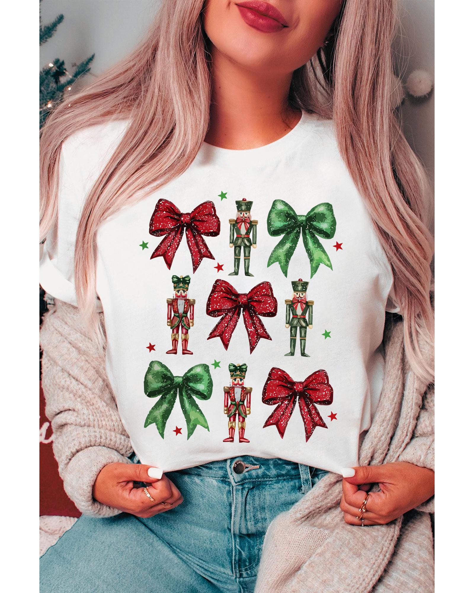 - White Bowknot Nutcracker Printed Crewneck Christmas T