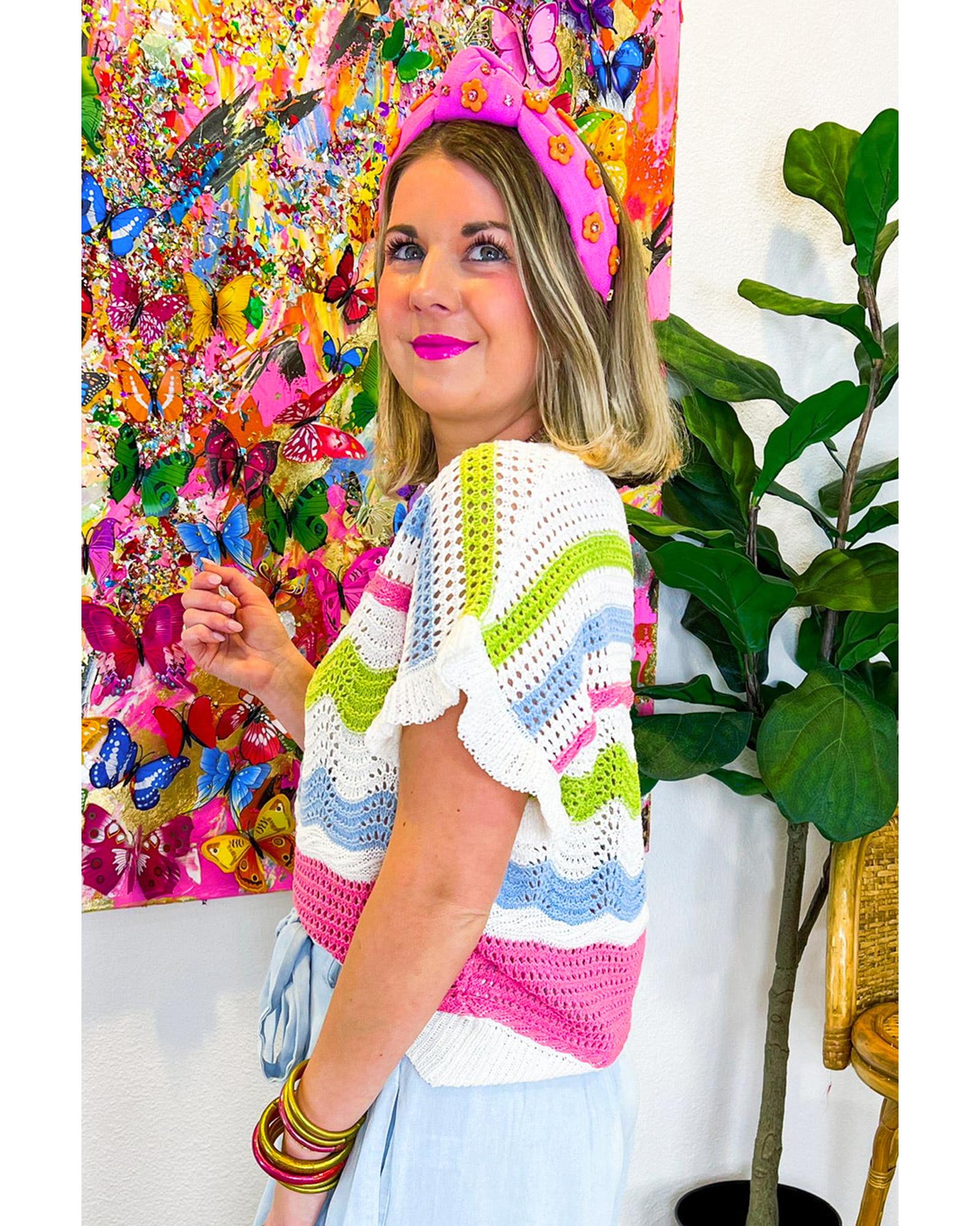 White Colorblock Crochet Knit Ruffled Short Sleeve Sweater Top - S Original price was: $62.99.Current price is: $33.99.