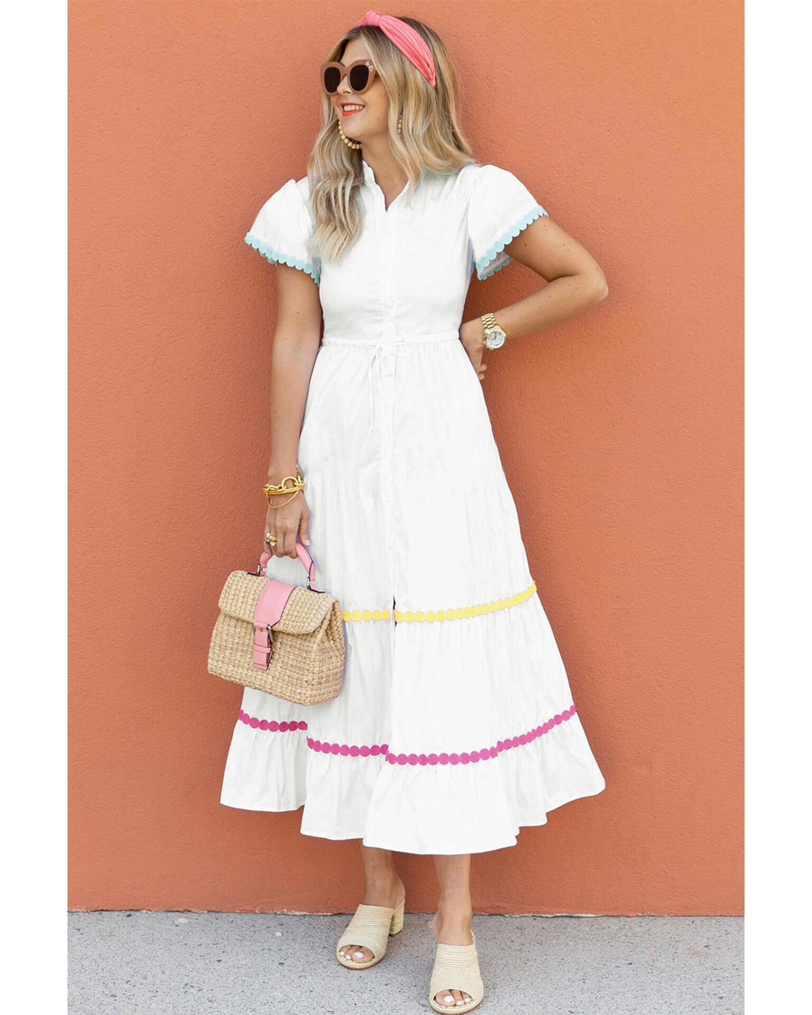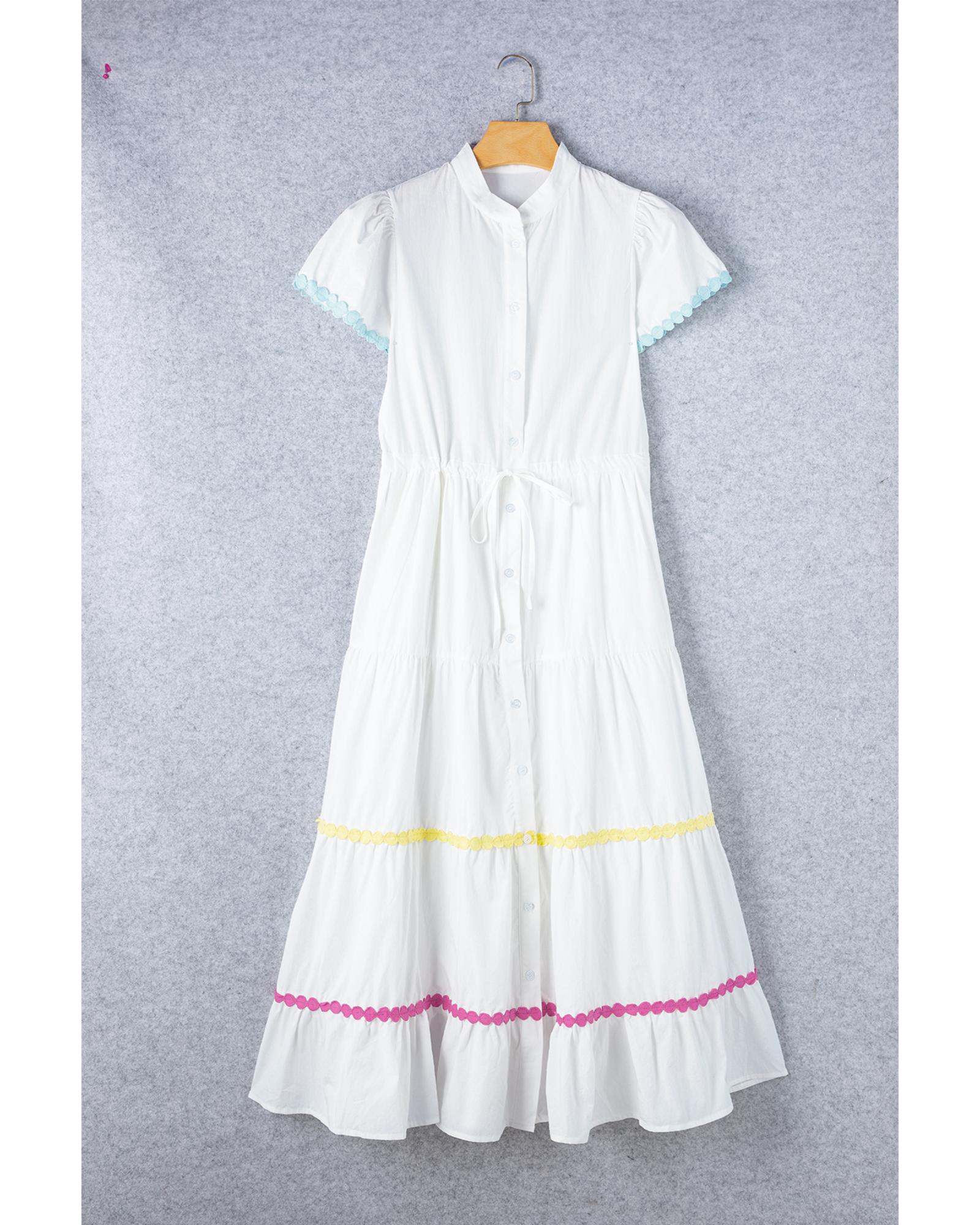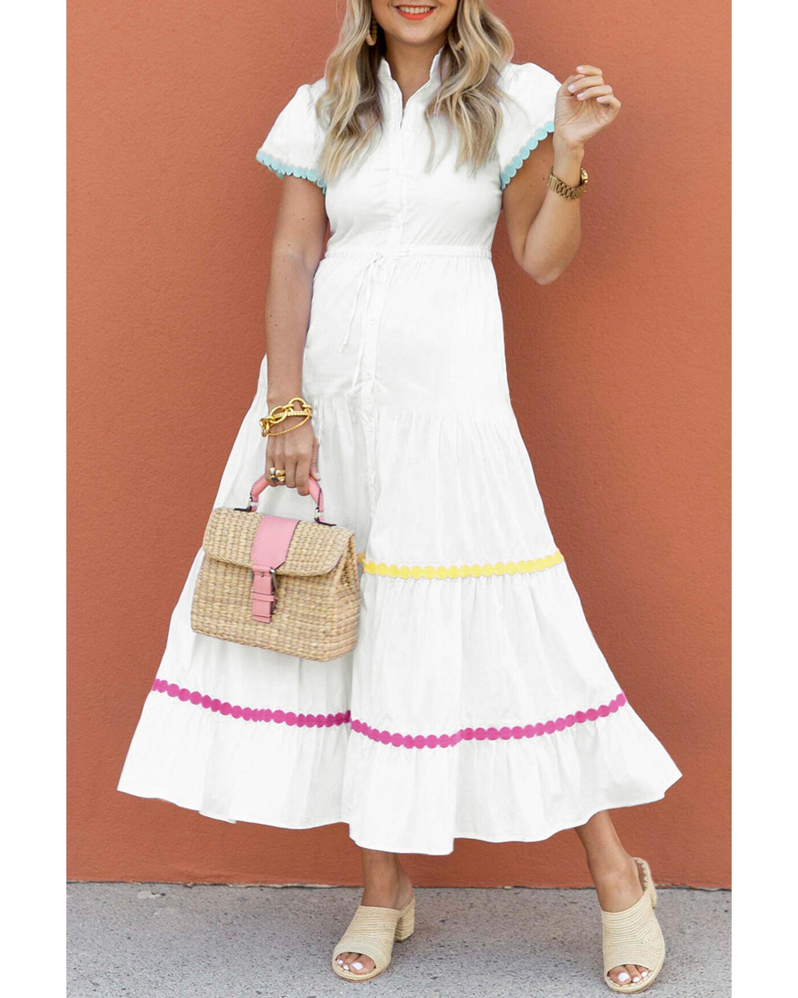 - White Colorblock Rickrack Trim Short Sleeve Drawstring Waist Long Dress
