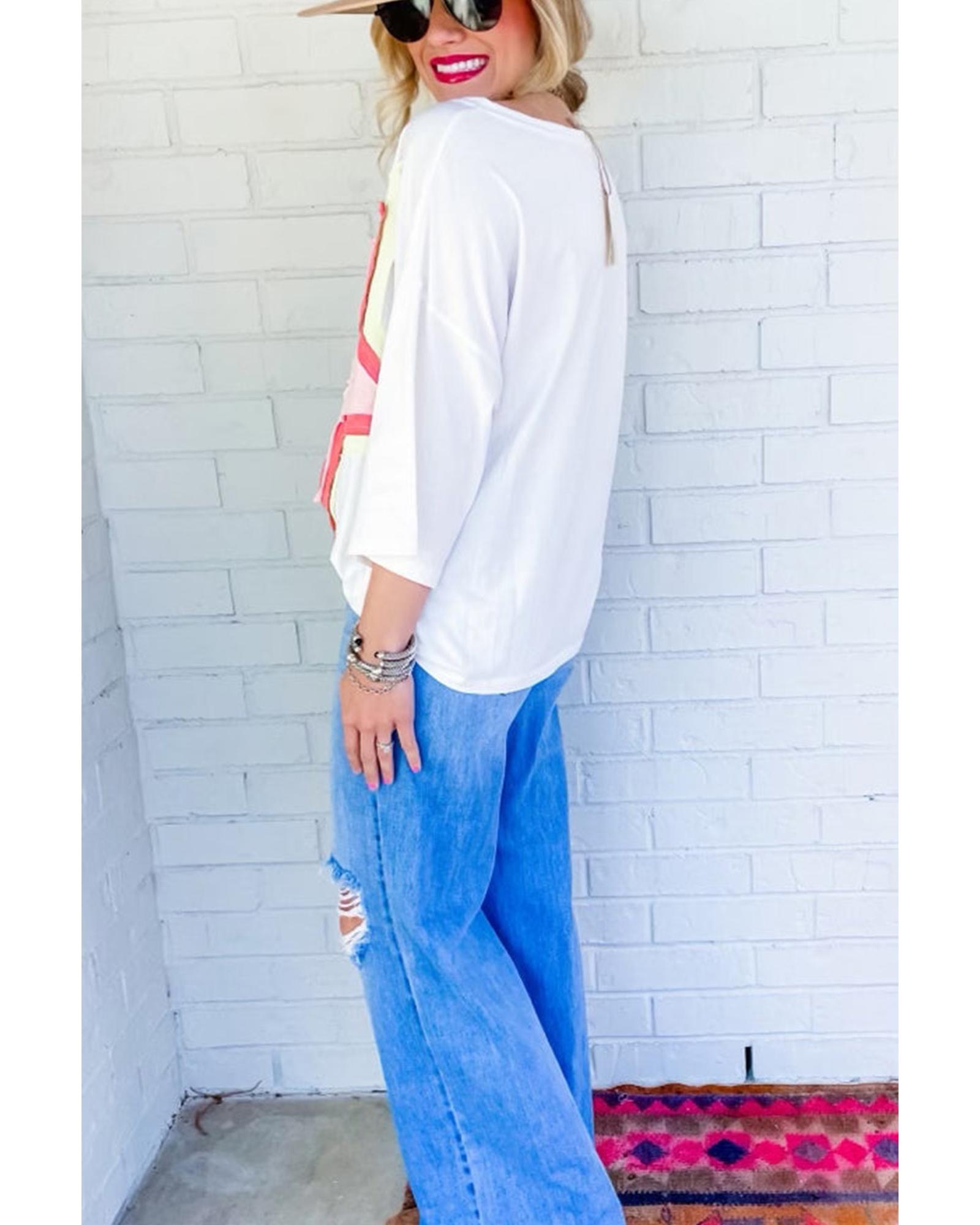 White Colorblock Star Patched Half Sleeve Oversized Tee – M
