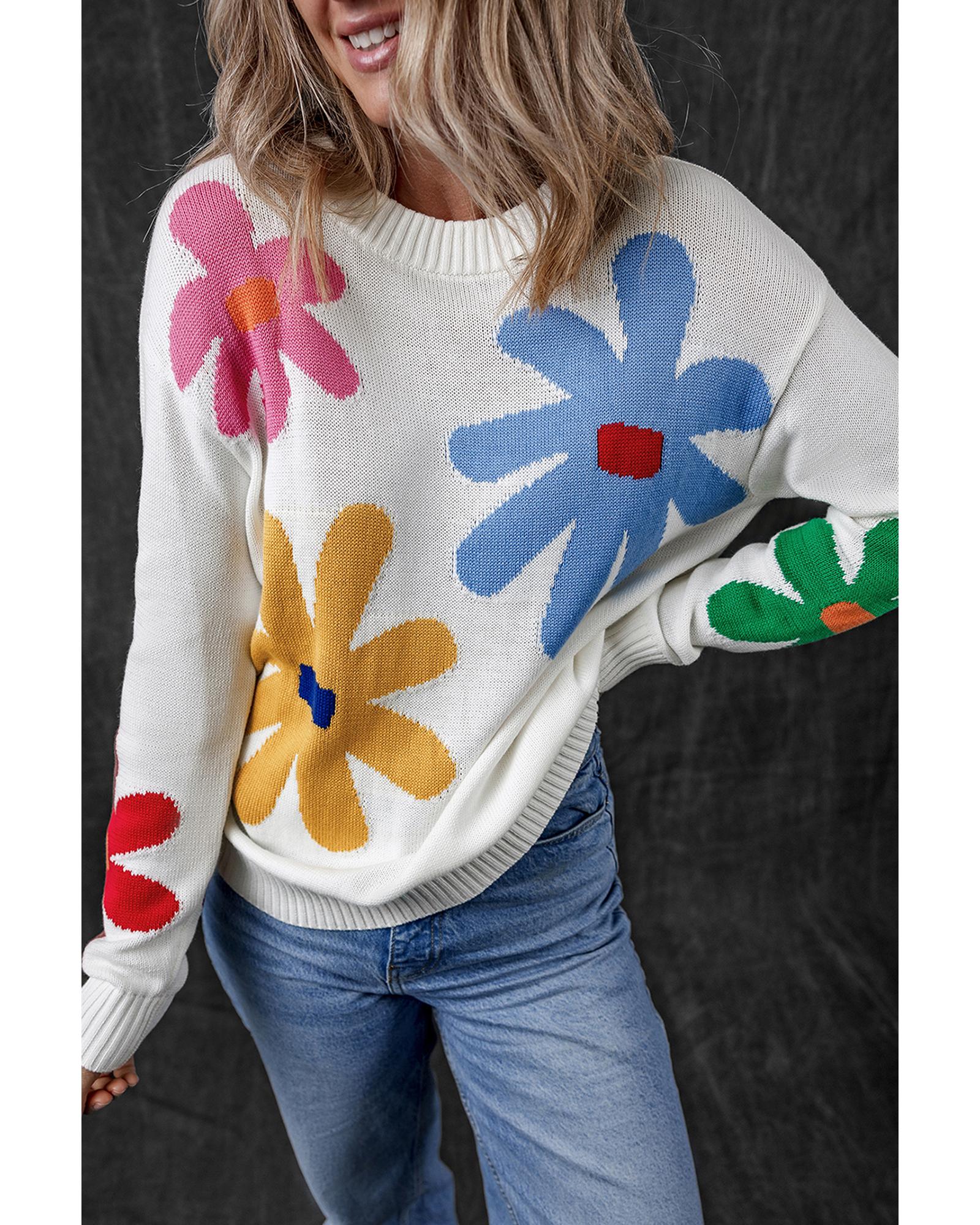 White Colorful Big Flower Pattern Crewneck Sweater – S