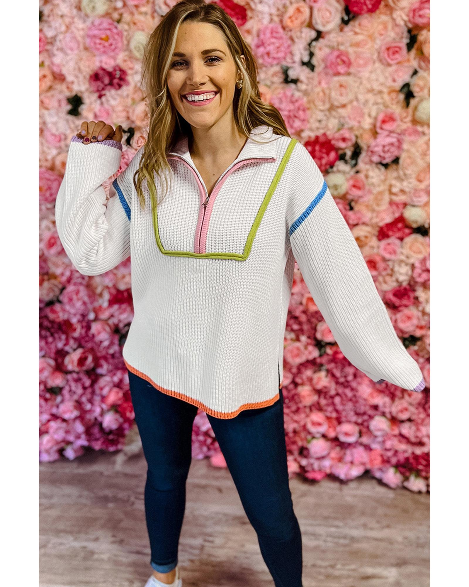 - White Colorful Edge Quarter Zip Drop Shoulder Sweater