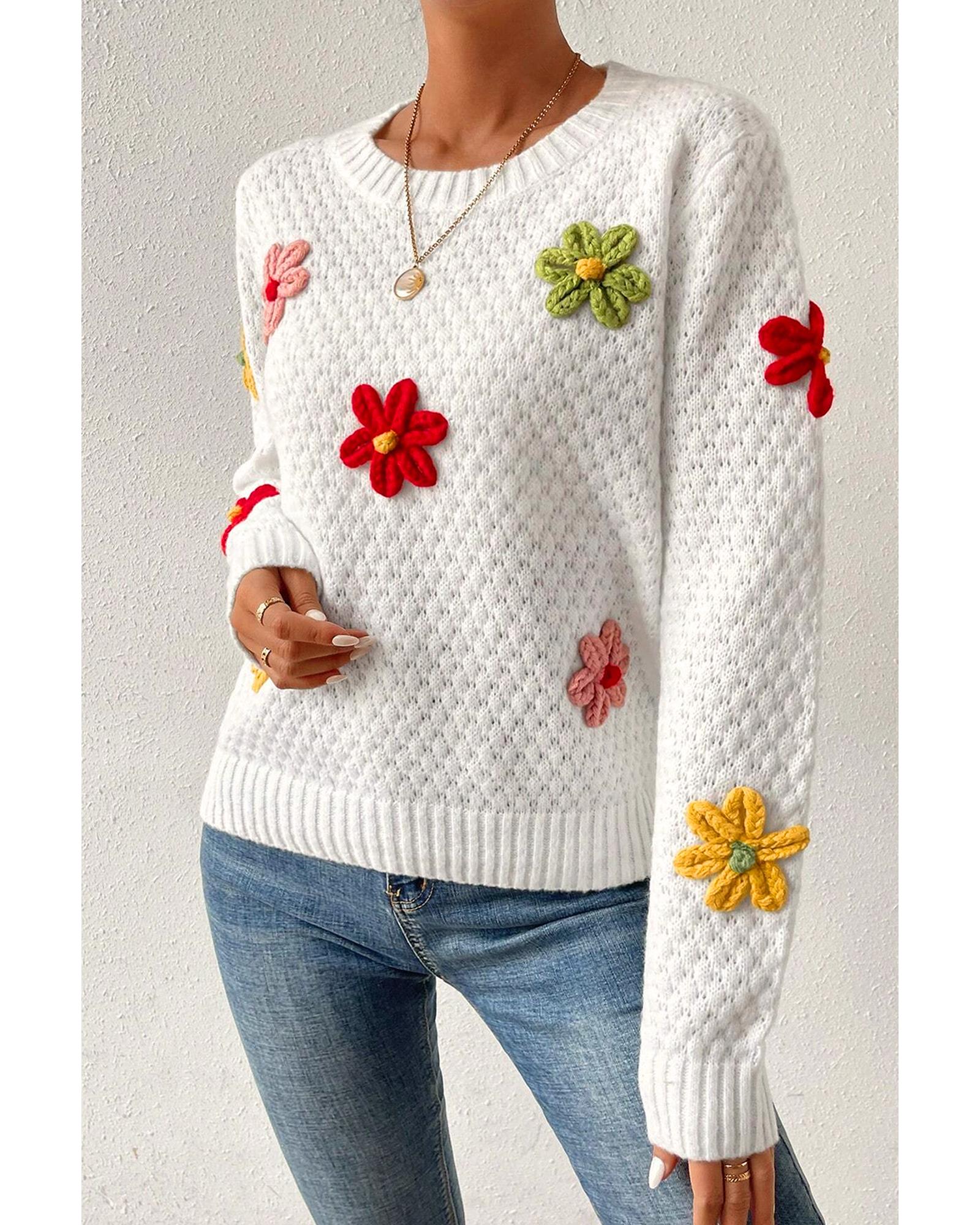 White Colorful Flower Applique Textured Knit Sweater – S