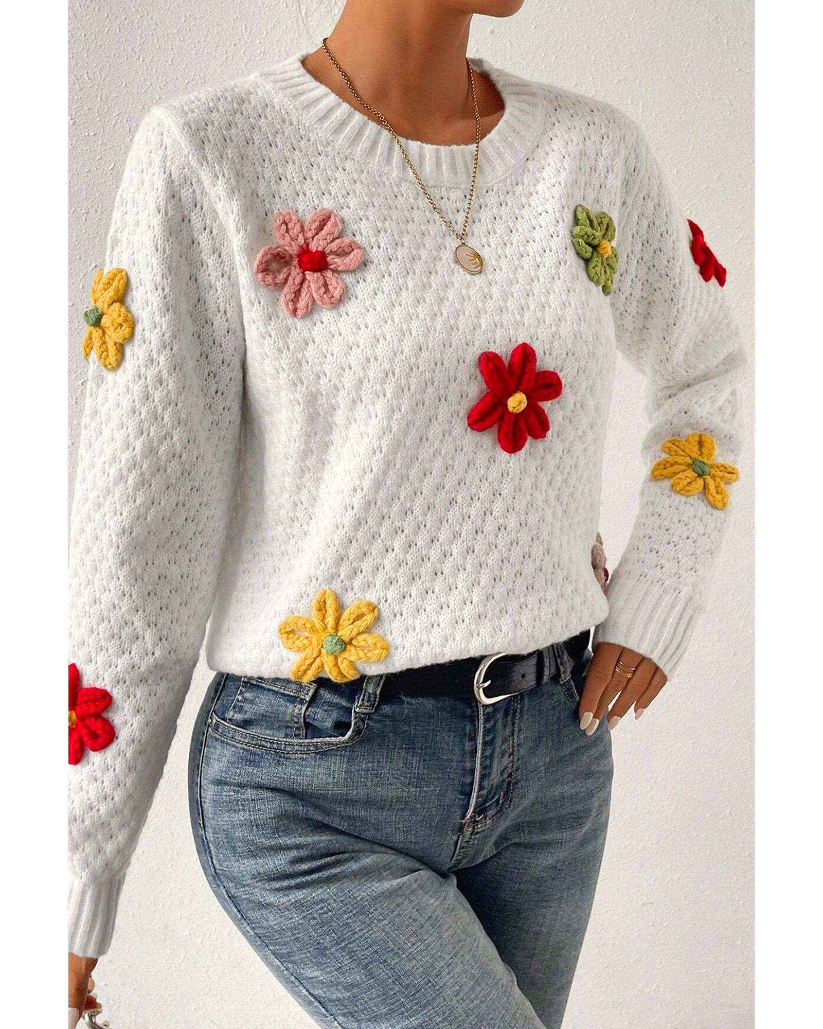 White Colorful Flower Applique Textured Knit Sweater – XL