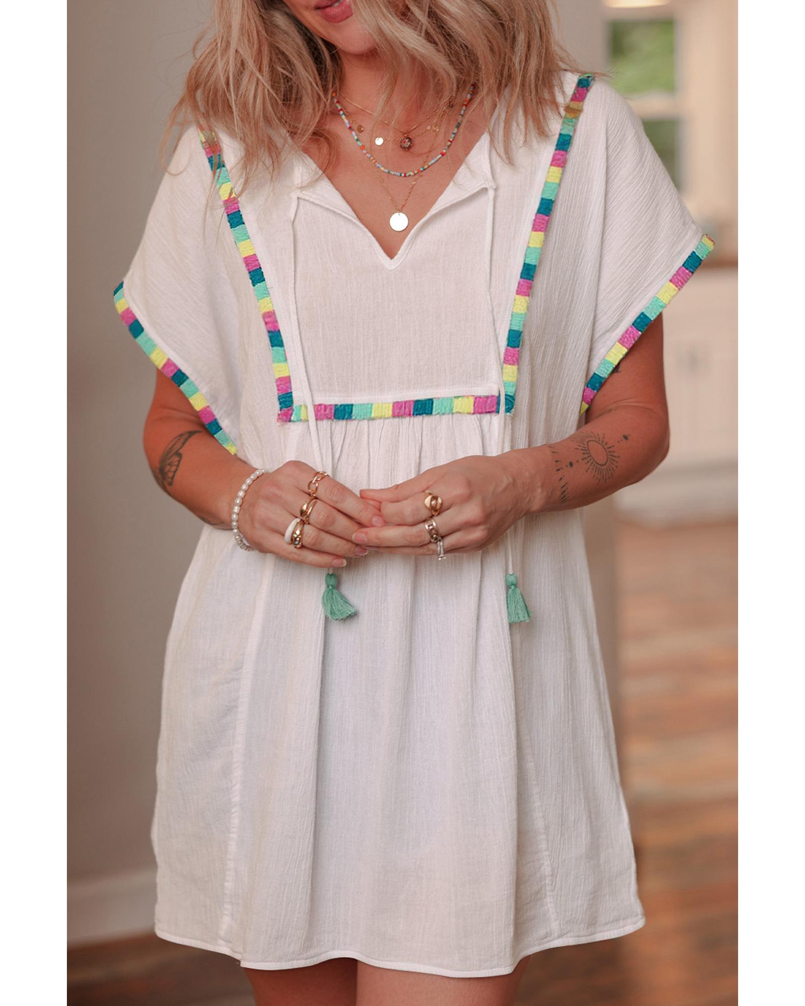 White Colorful Fringed Detail Tassel Tie Neck Short Sleeve Blouse – M