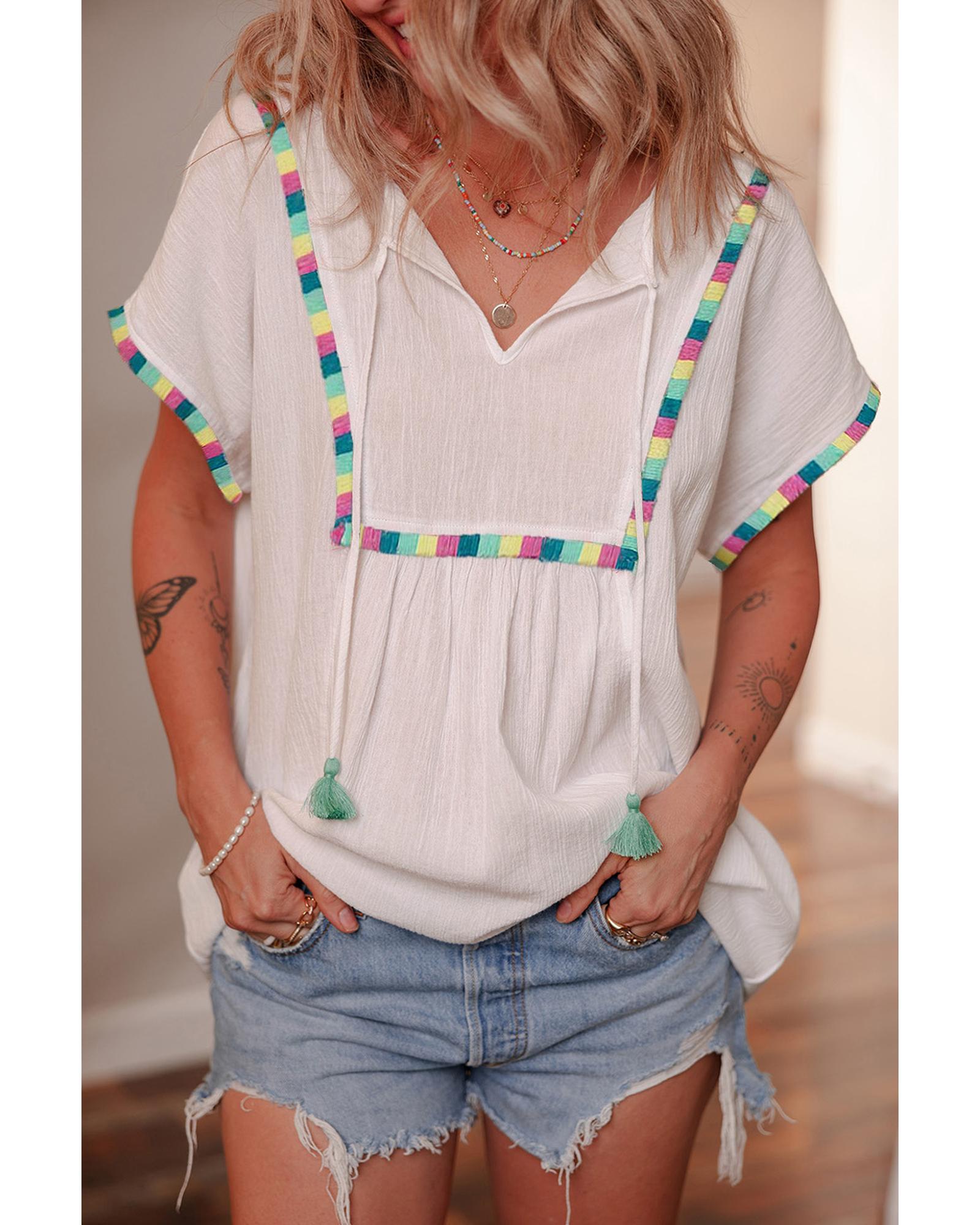 White Colorful Fringed Detail Tassel Tie Neck Short Sleeve Blouse – S