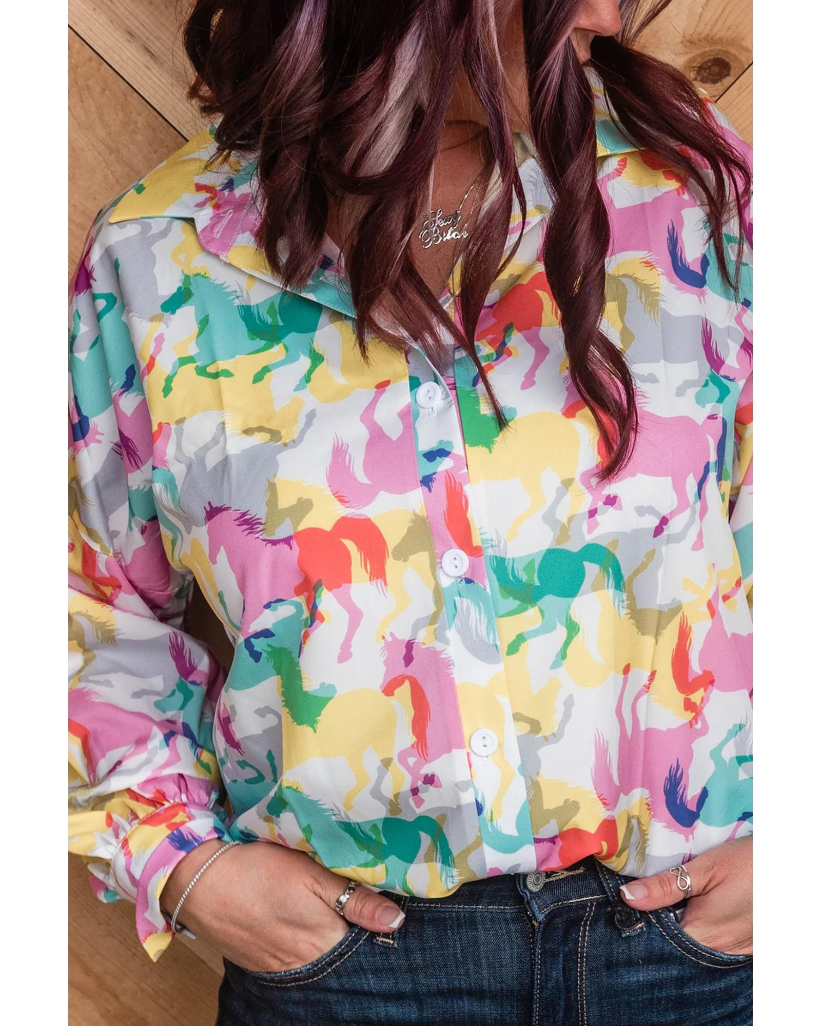 White Colorful Horse Printed Long Sleeve Button Up Casual Shirt – S