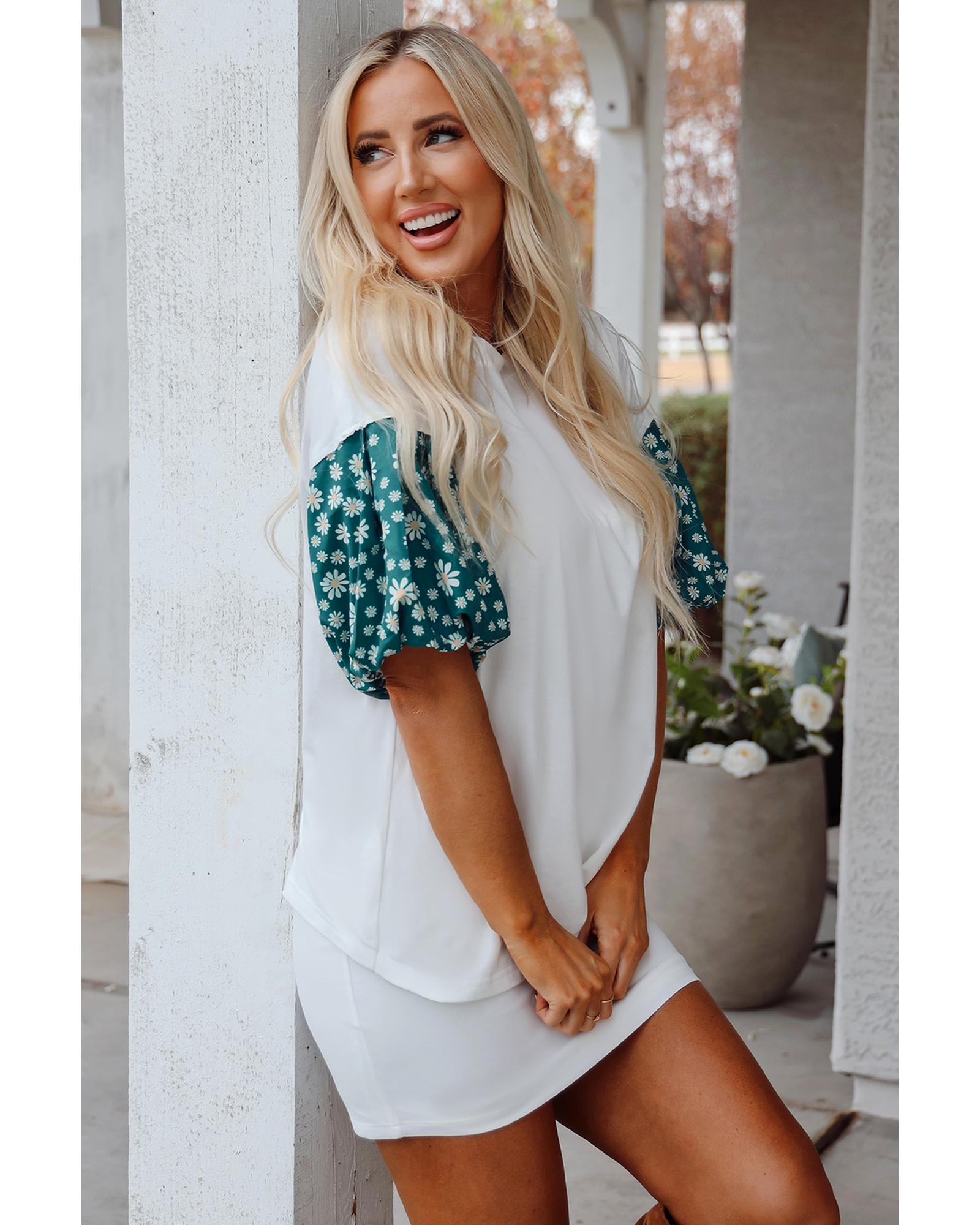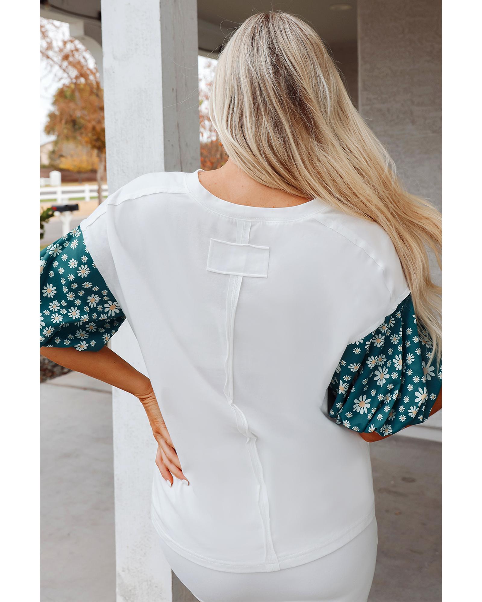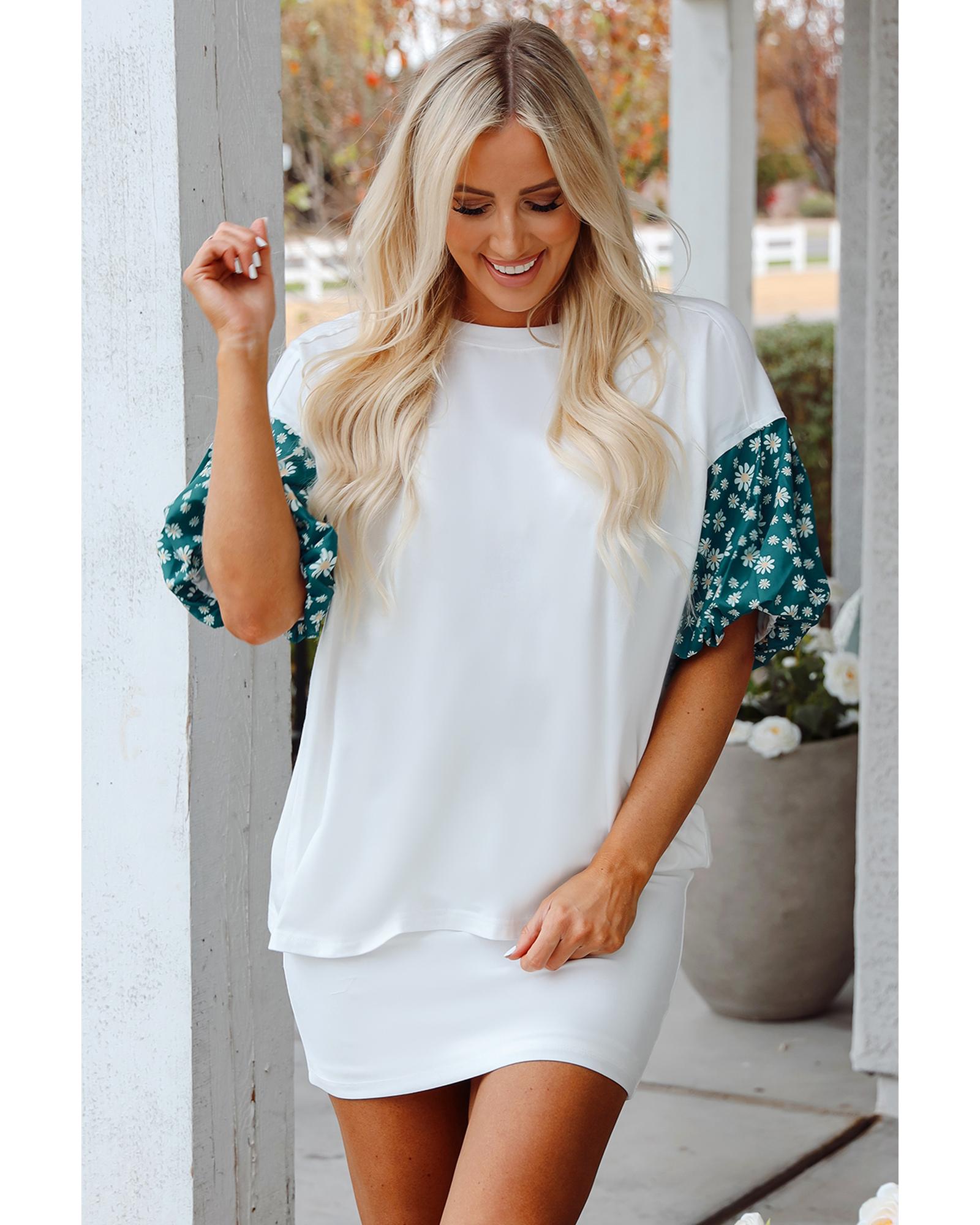 White Contrast Floral Puff Sleeve Oversized Top – L
