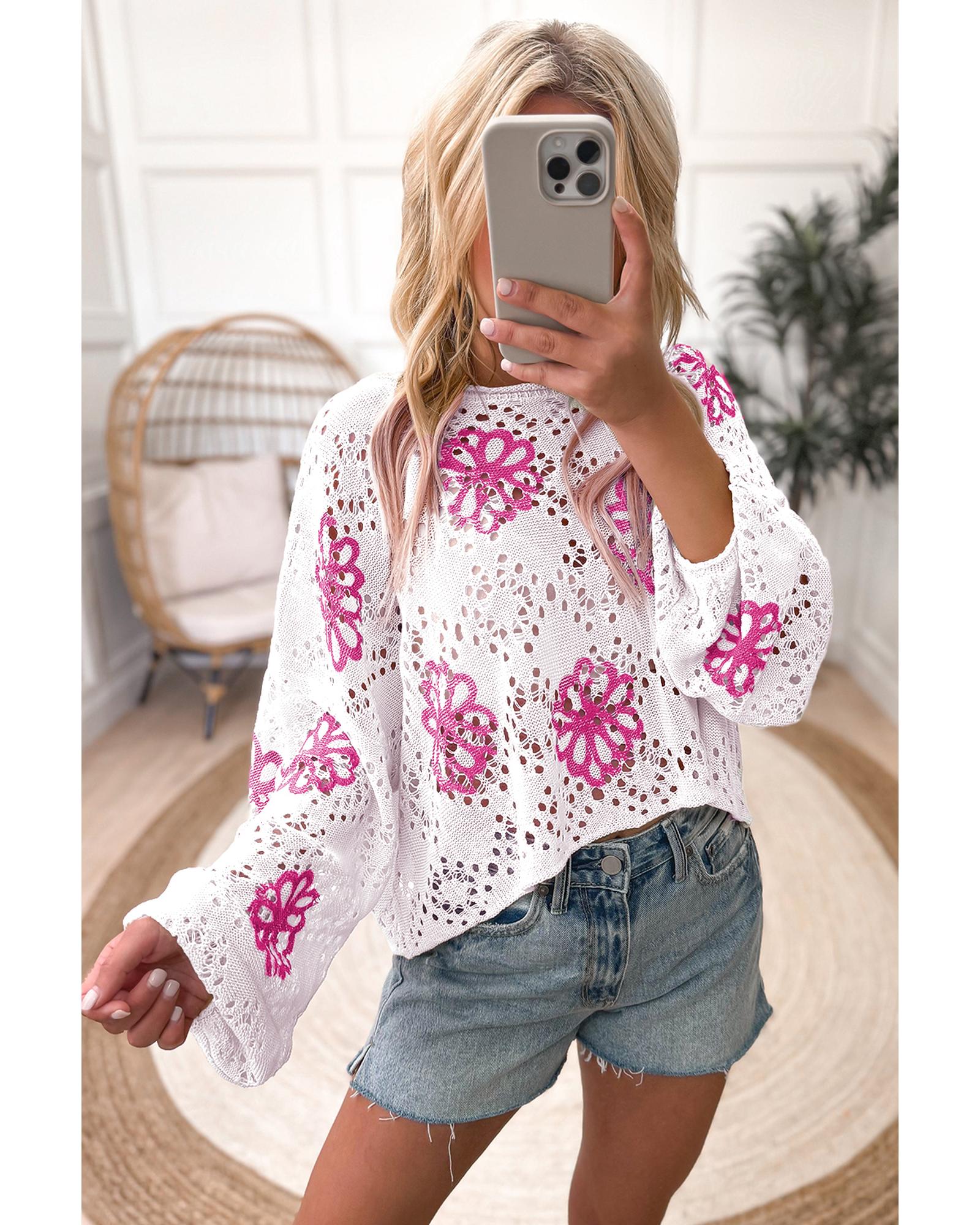 - White Contrast Flower Print Eyelet Drop Shoulder Sweater