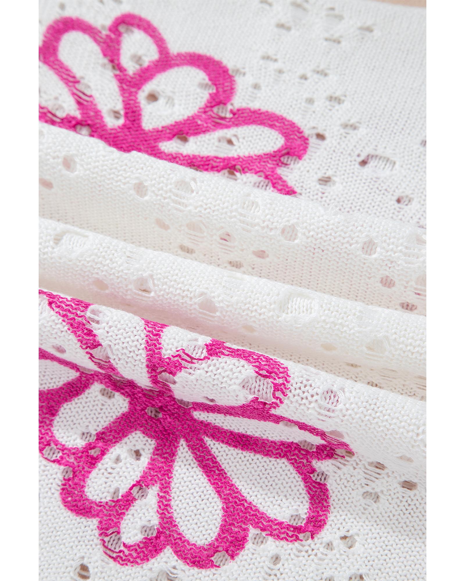 • White Contrast Flower Print Eyelet Drop Shoulder Sweater
