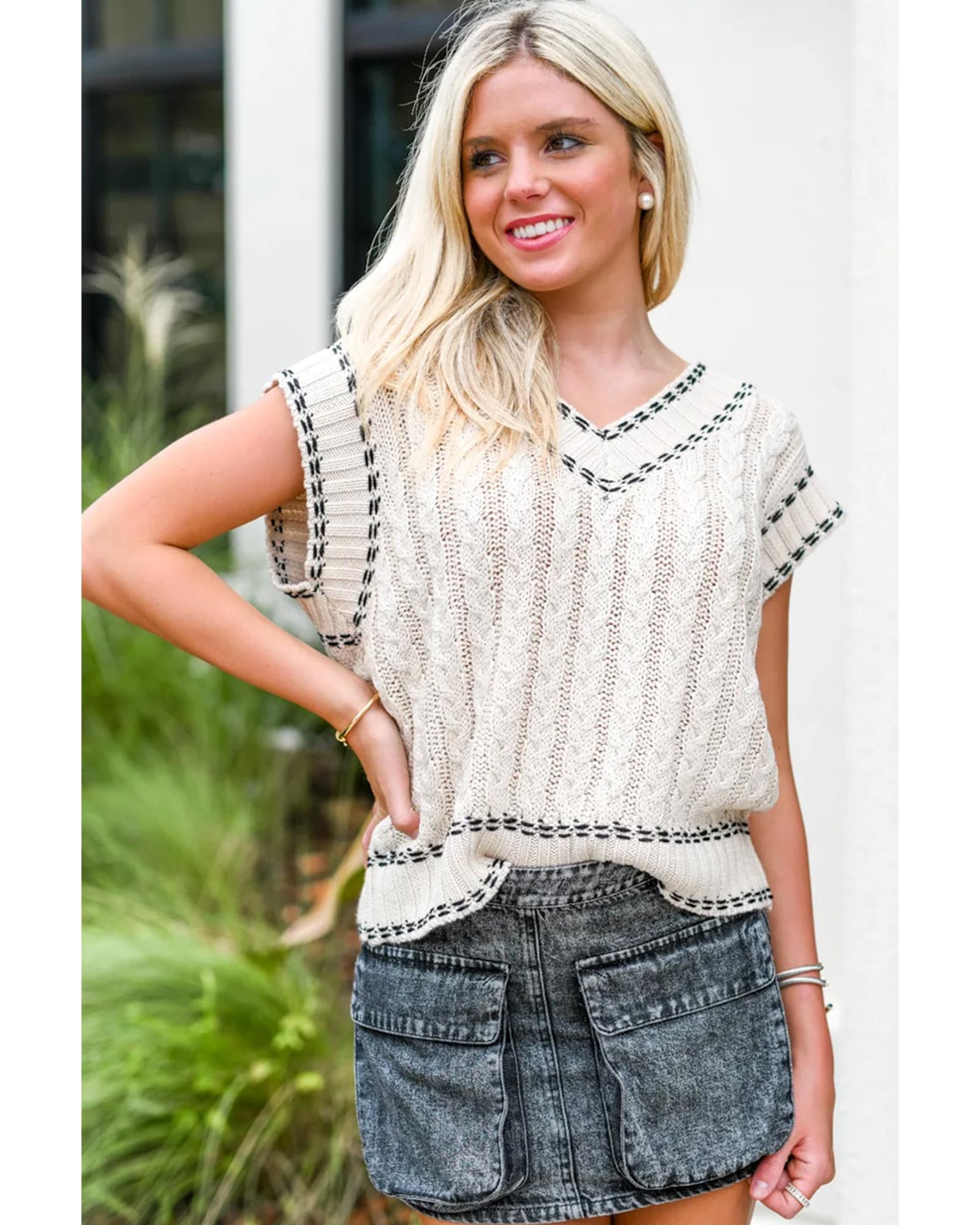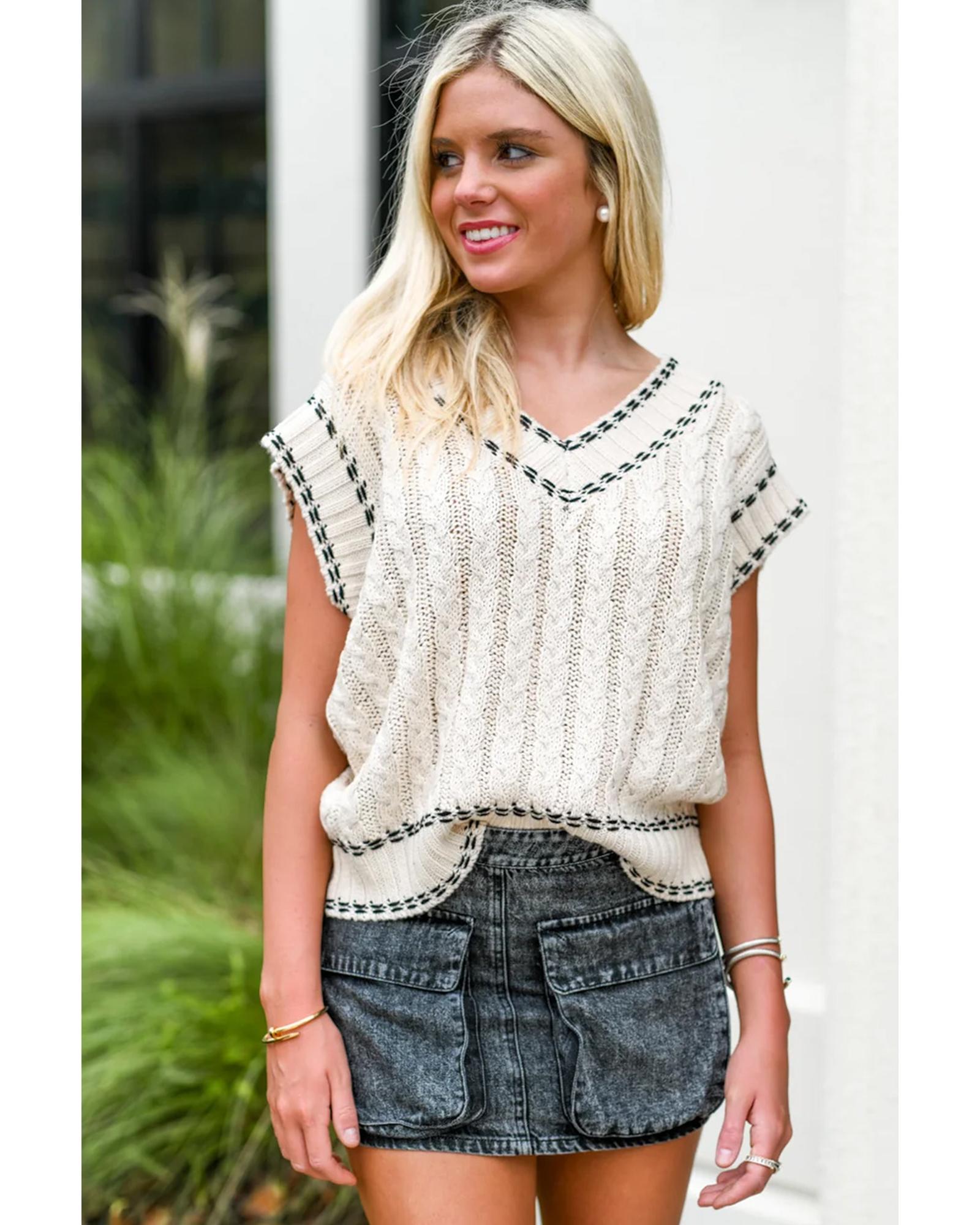 White Contrast Trim V Neck Cable Knit Sweater Vest – M