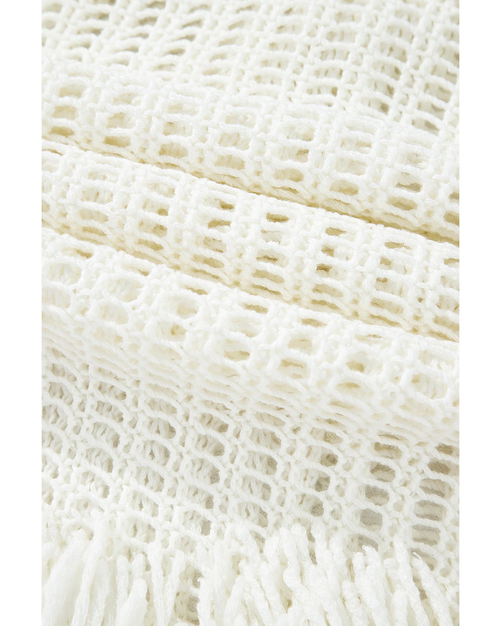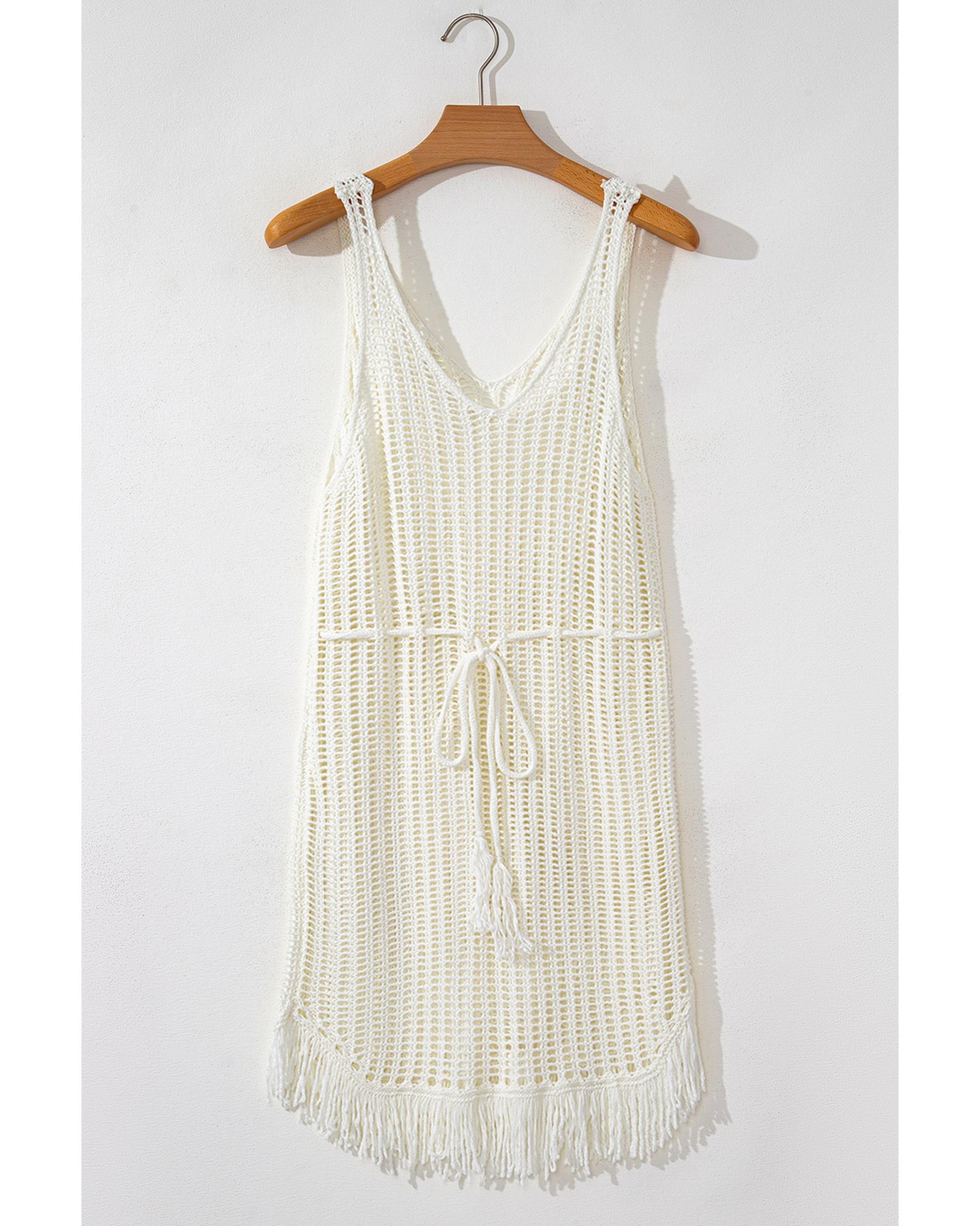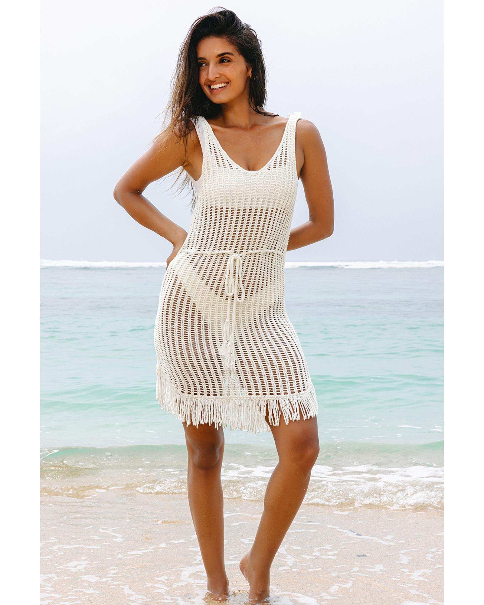 White Crochet Fishnet Fringed Edge V Neck Beach Cover Up – S