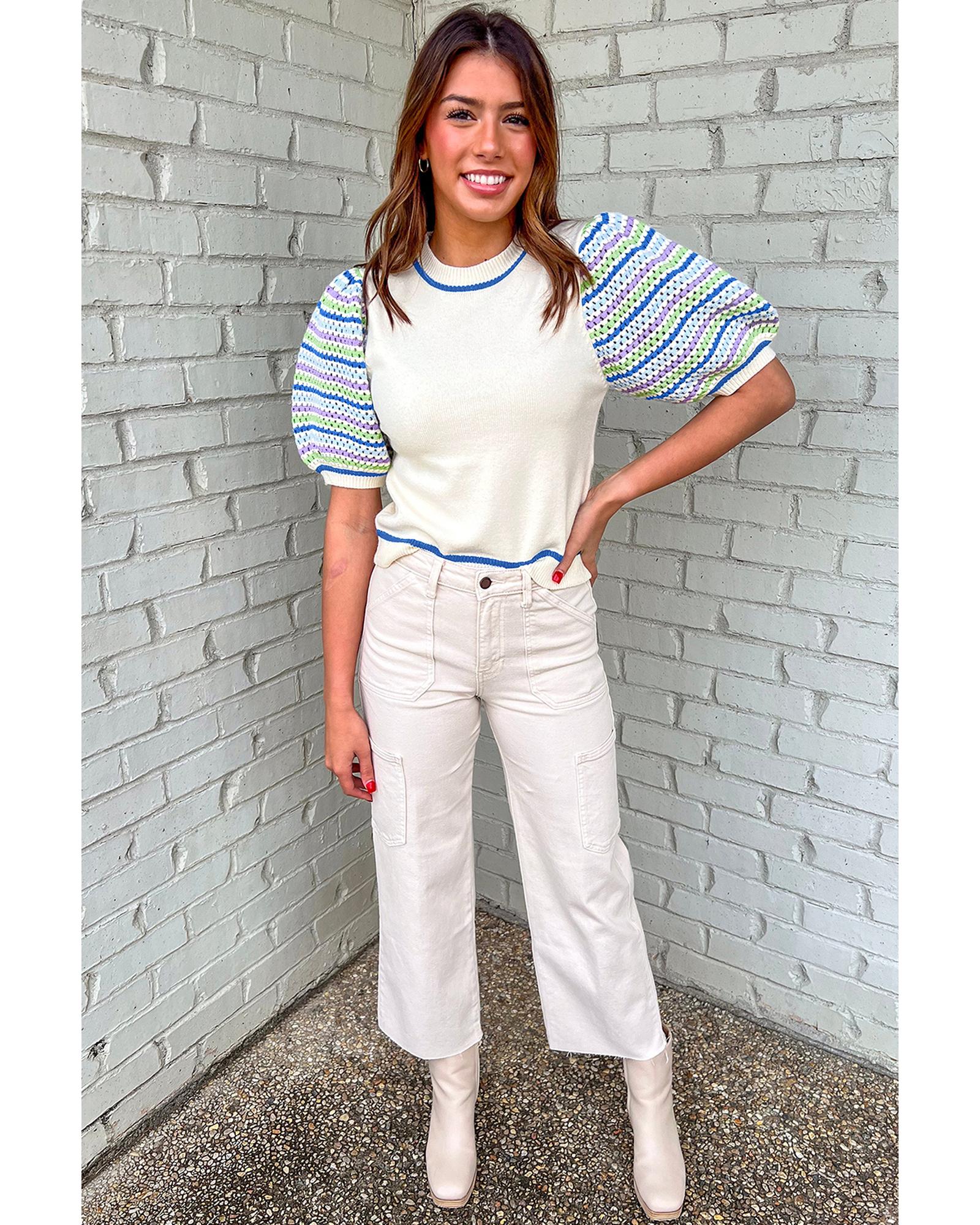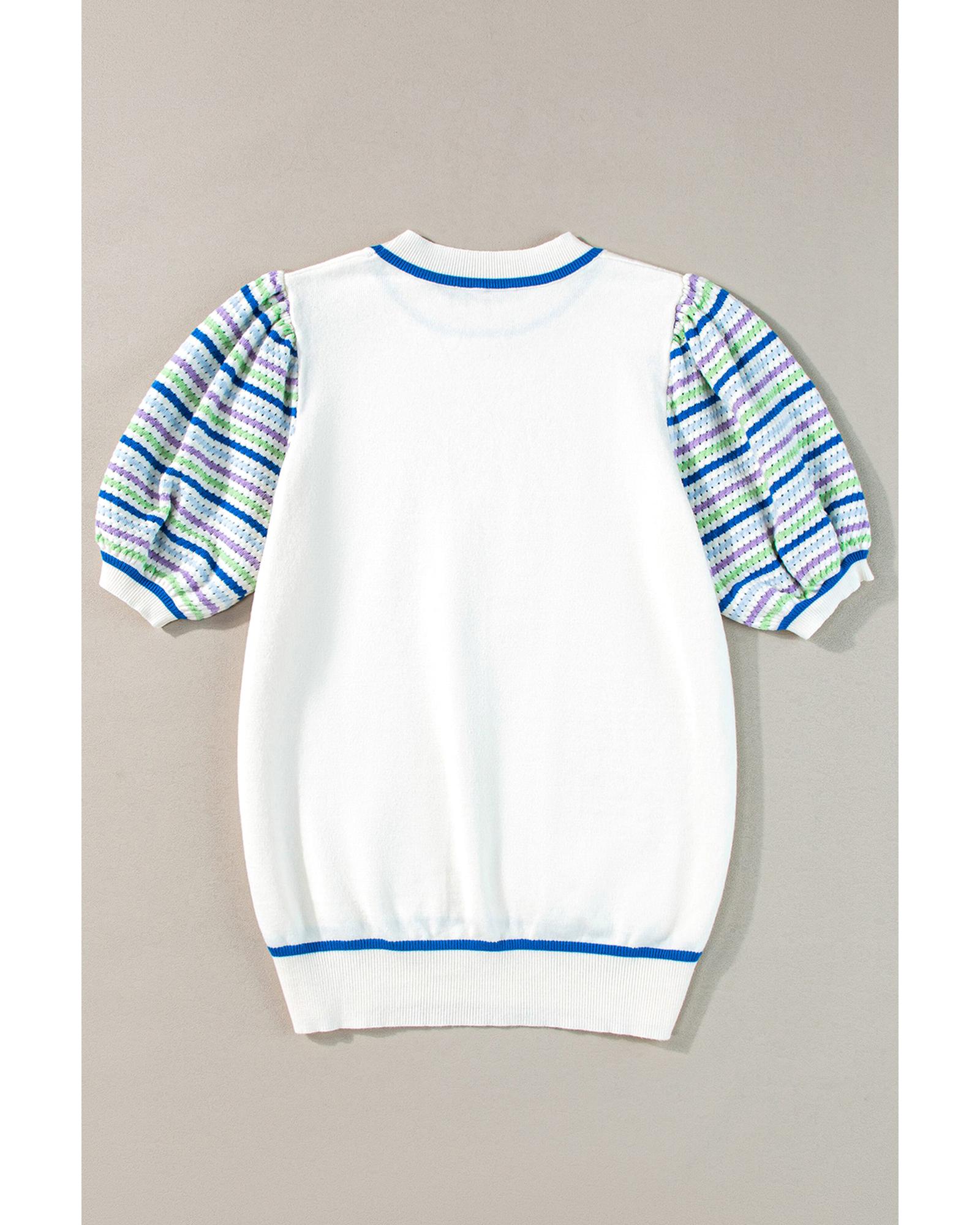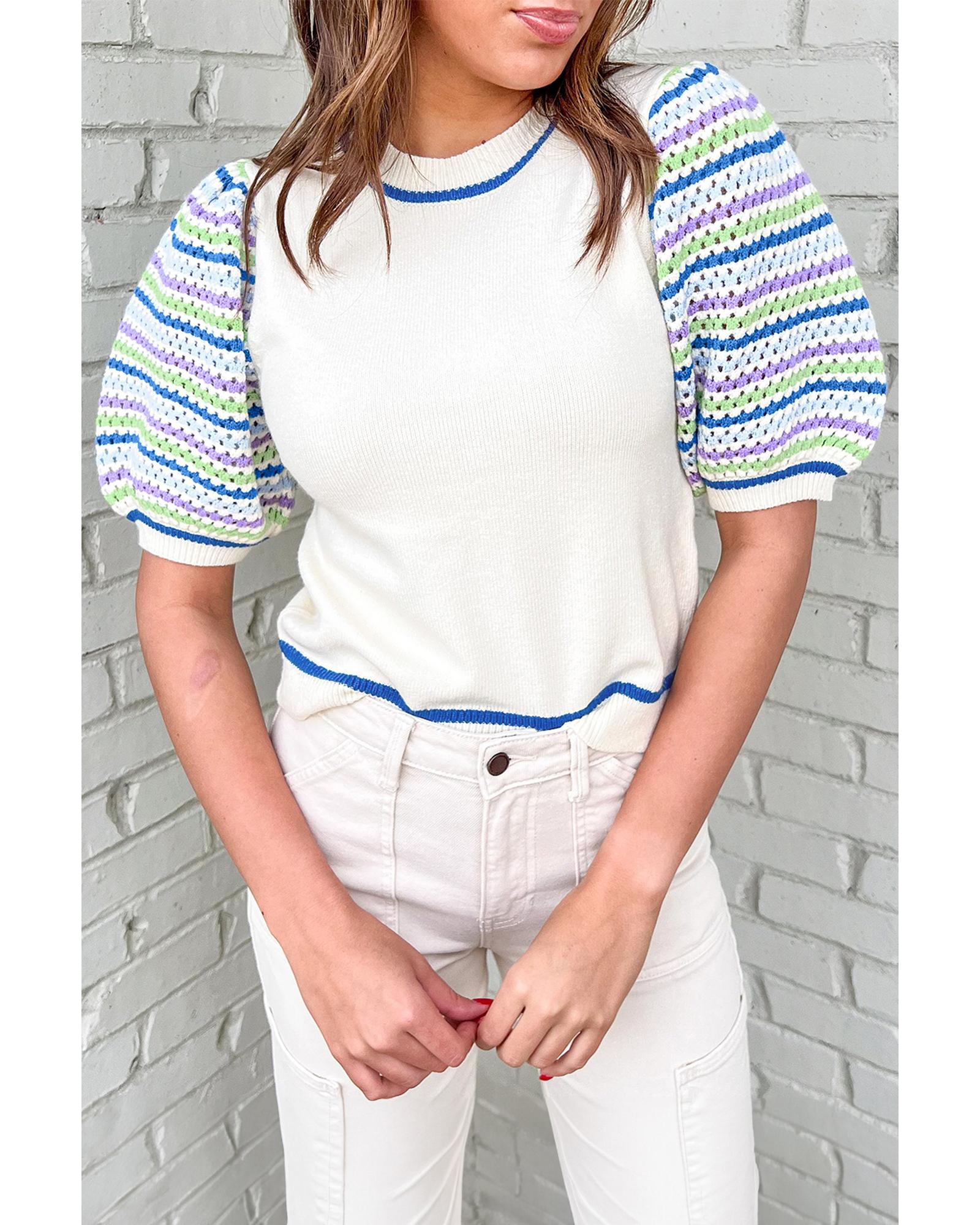 White Crochet Striped Bubble Sleeve Knit Sweater – M