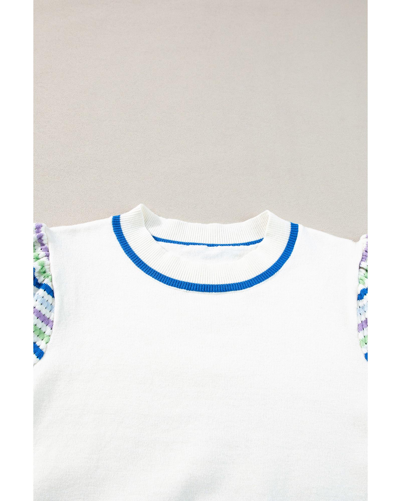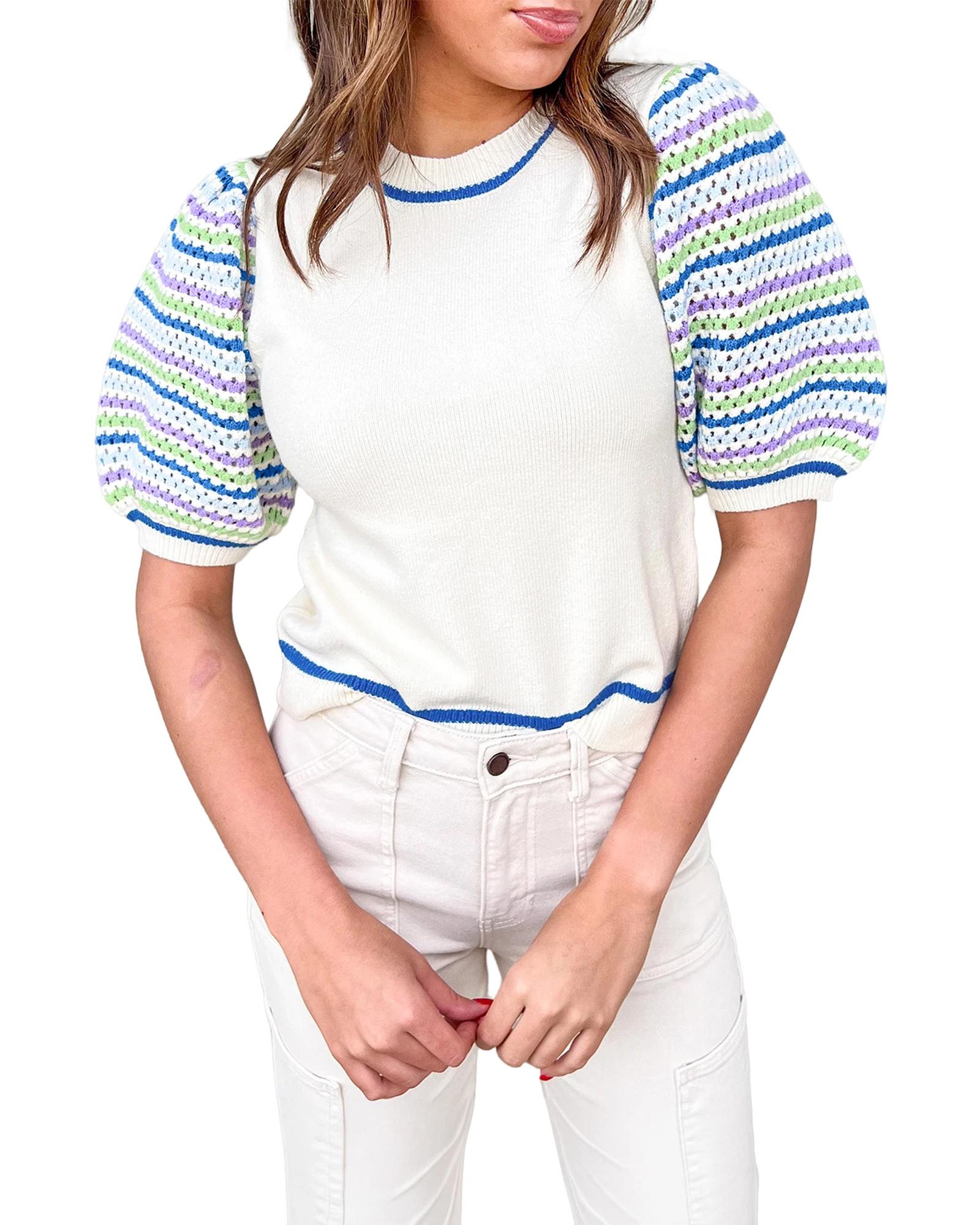 White Crochet Striped Bubble Sleeve Knit Sweater – S