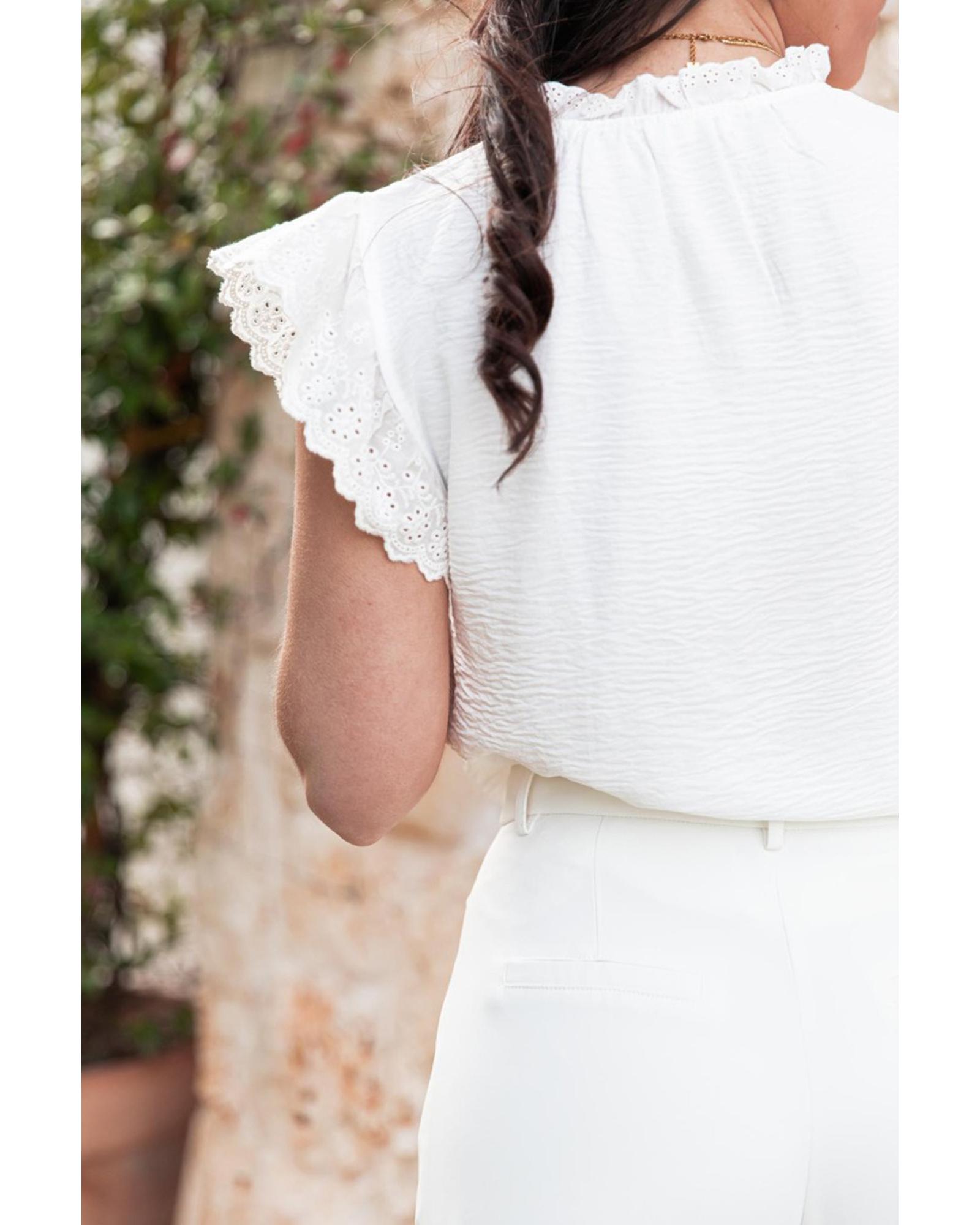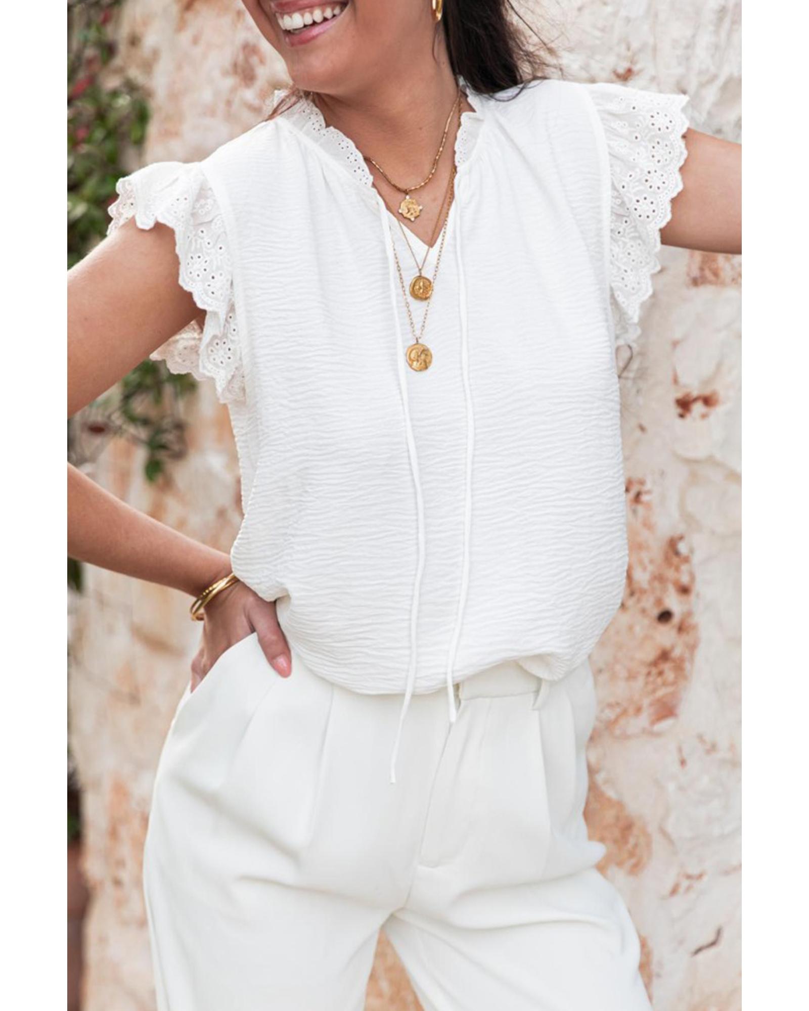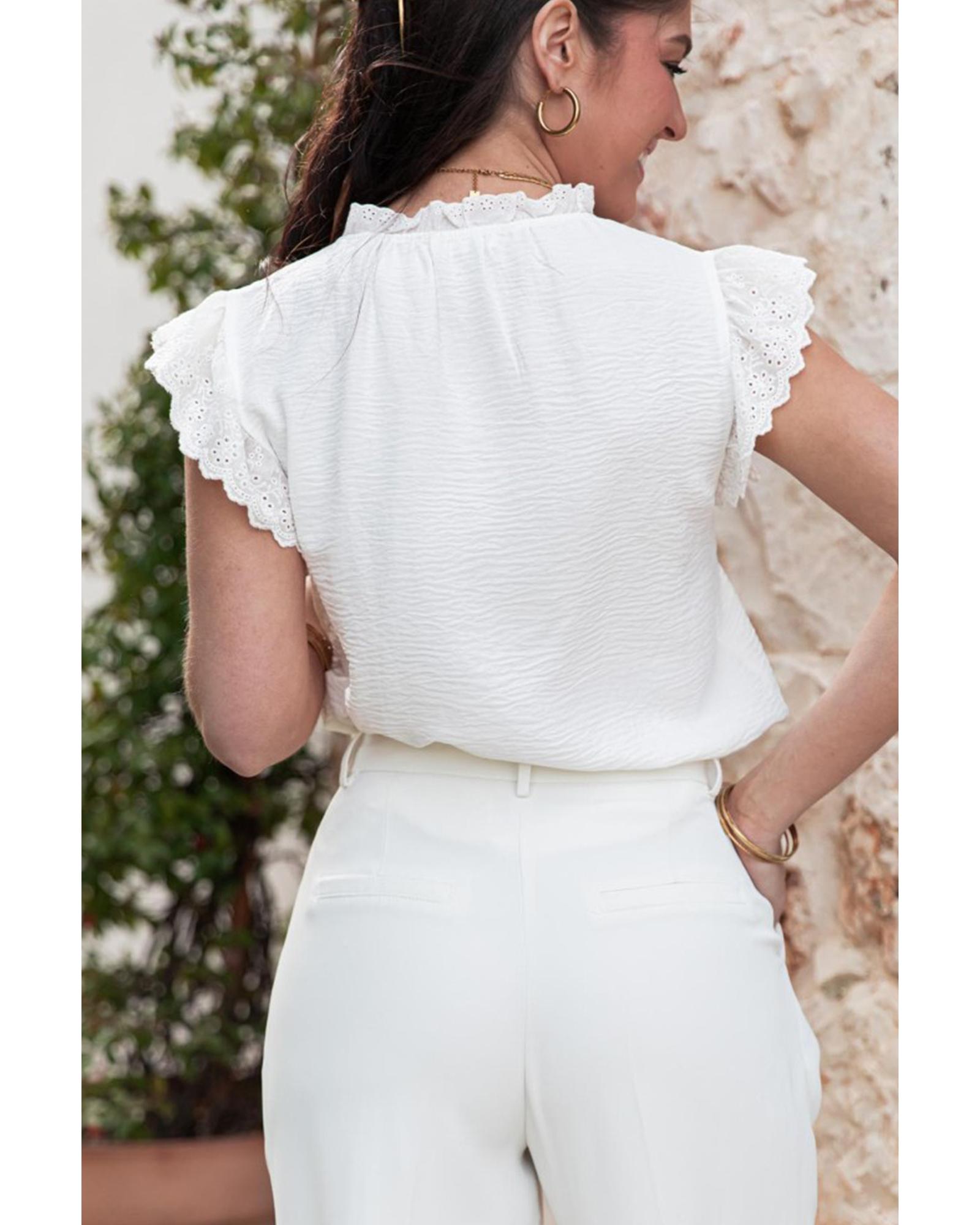 White Embroidered Ruffle Trim Textured Blouse – XL
