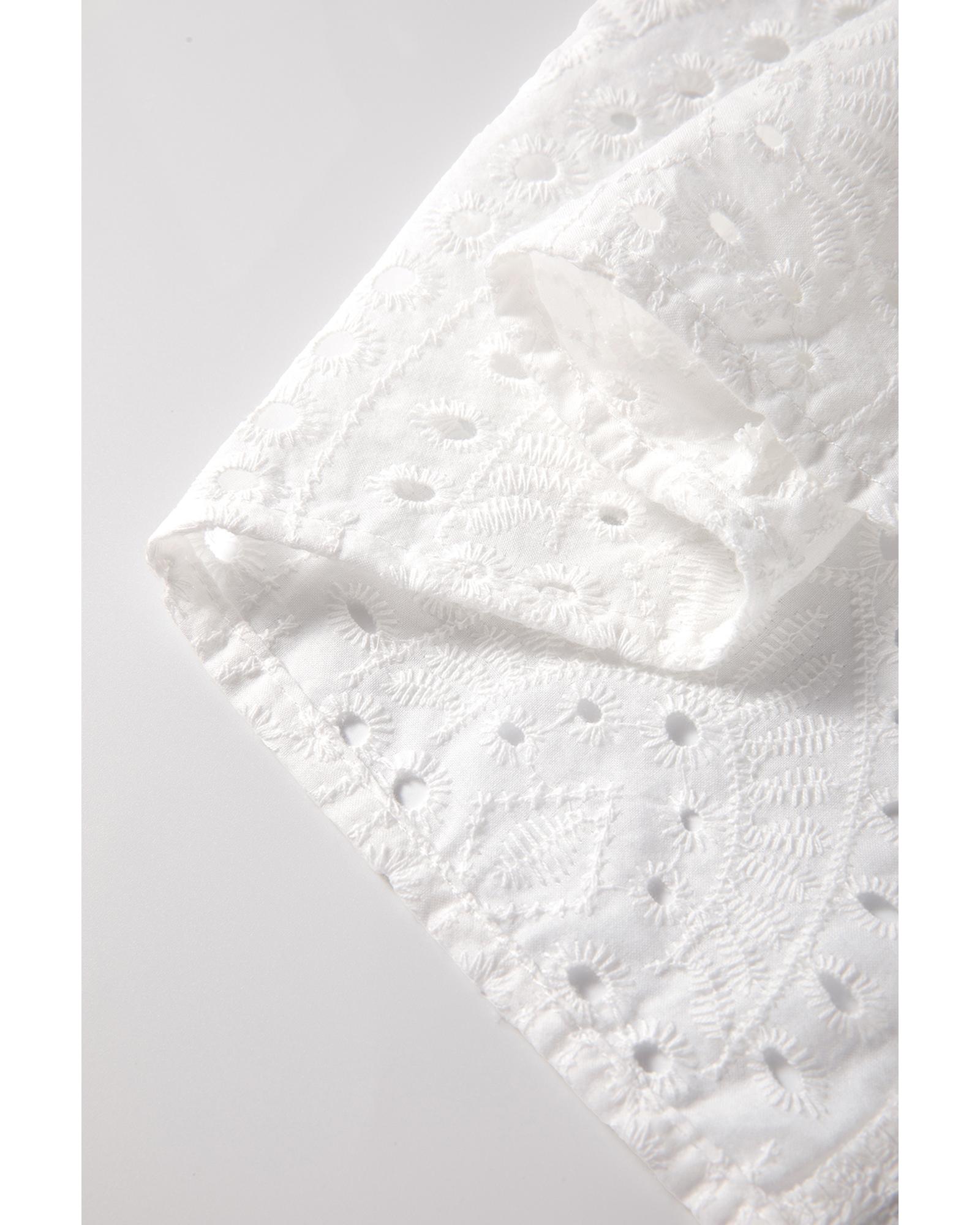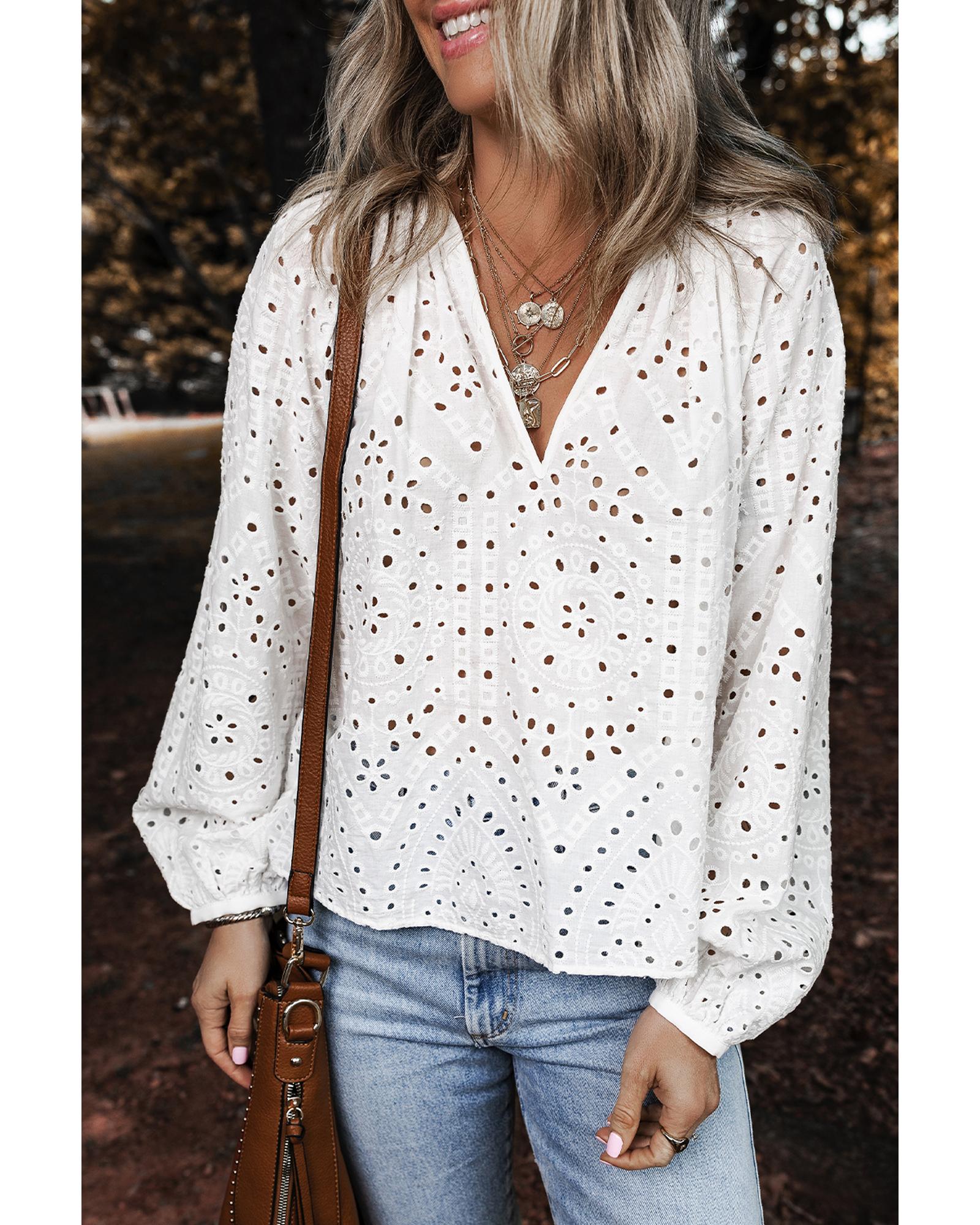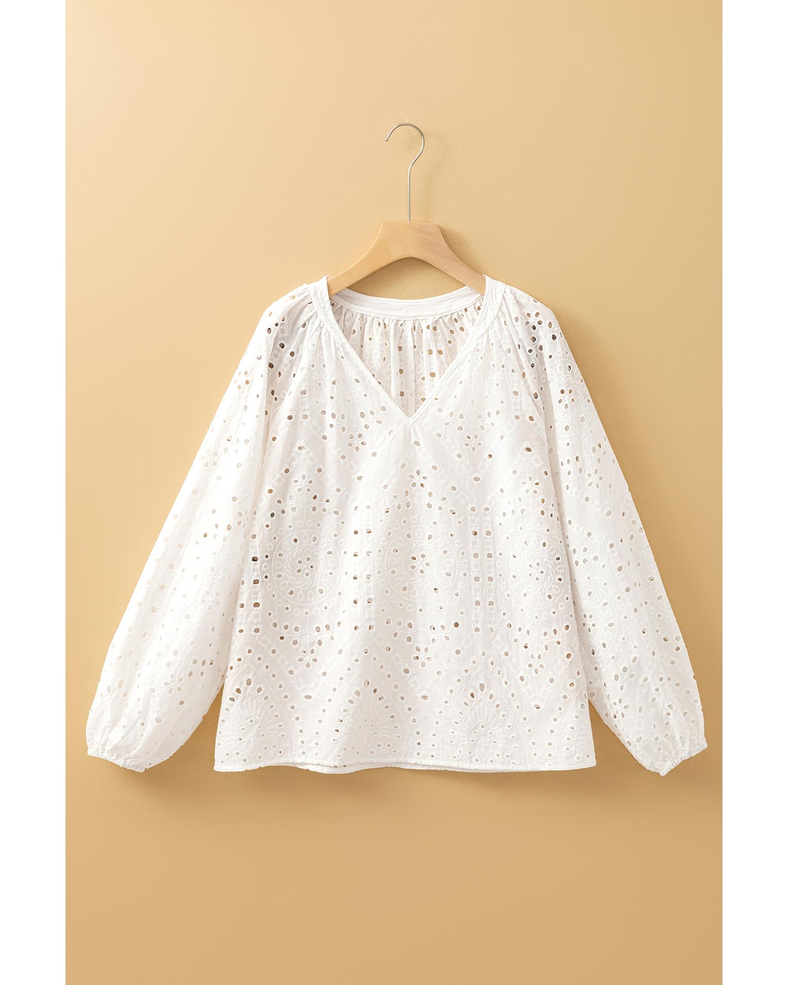 White Eyelet Embroidered Puff Sleeve V Neck Blouse – M