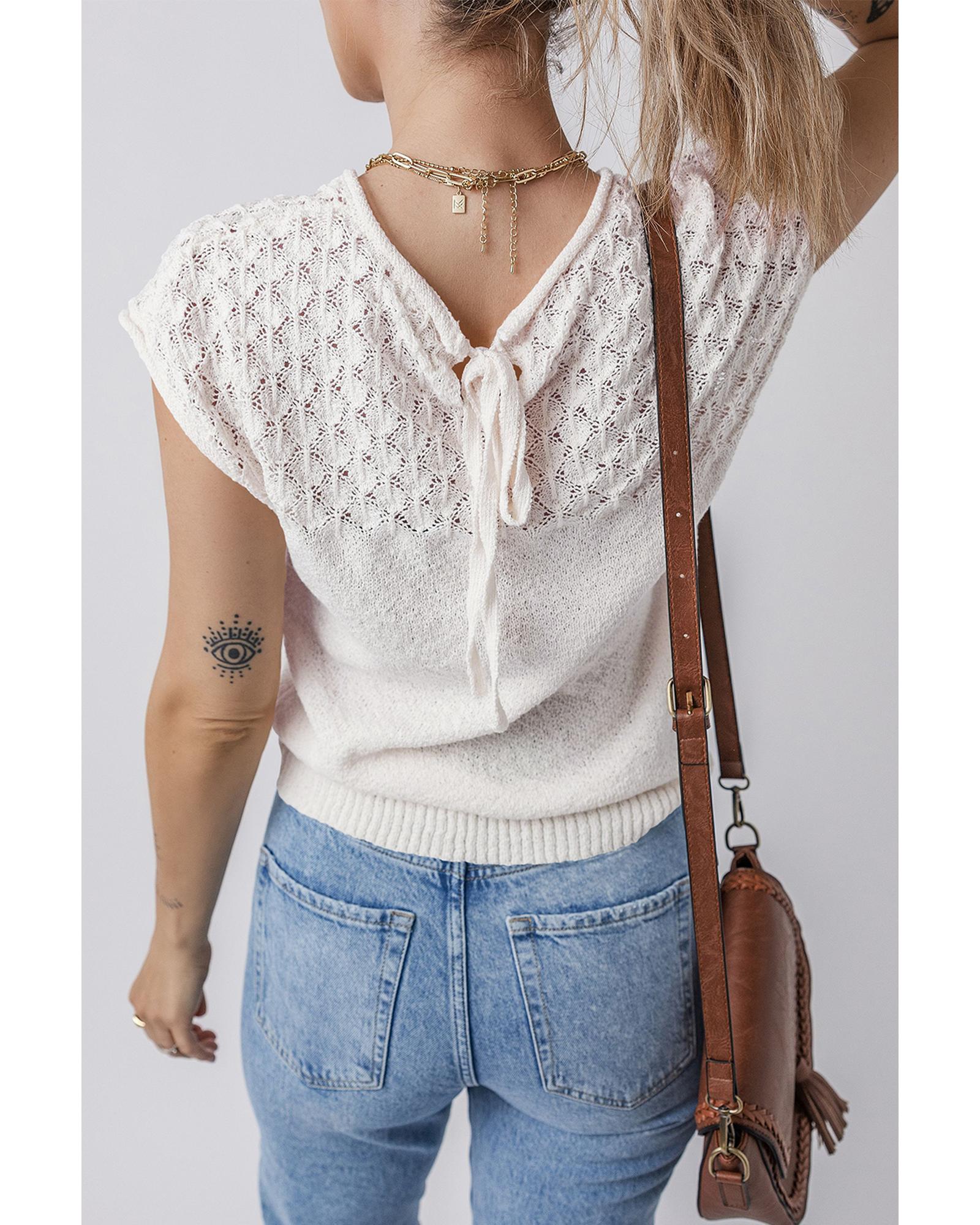 White Eyelet Knit Tied Back Short Sleeve Sweater – 2XL